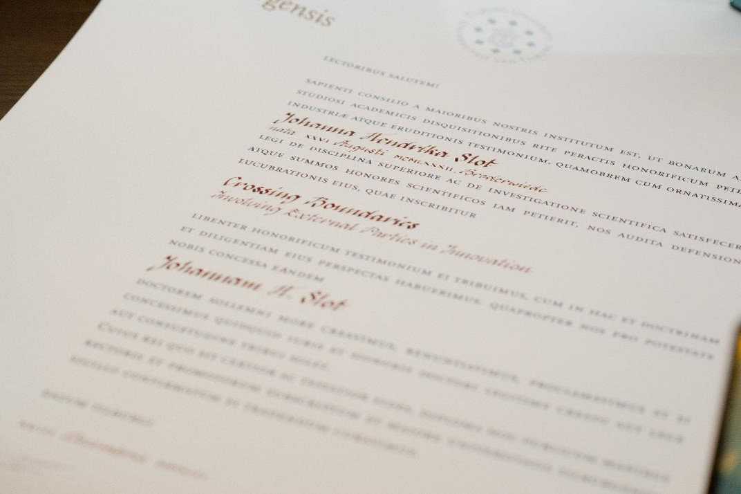 De verdediging was nog best spannend! 45 minuten lang kreeg ik (soms erg lastige!) vragen van de commissie, die ik zo goed mogelijk beantwoordde. De pedel kwam mooi op tijd met haar ‘Hora Est’ (oftewel, the hour is now) als signaal dat ik mocht ophouden met praten. Nadat de commissie zich vervolgens had teruggetrokken voor overleg en nadat ik de spanning wat kwijt was, kwam de commissie weer terug. Van Inge kreeg ik de formele woorden en de bul, en van Stefan kreeg ik een mooie laudatio (ere-toespraak). Vanaf dat moment mag ik me officieel Dr. Johanna Slot noemen (of Johanna Slot, PhD, mag ook)!