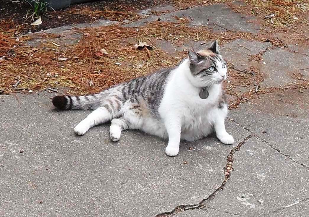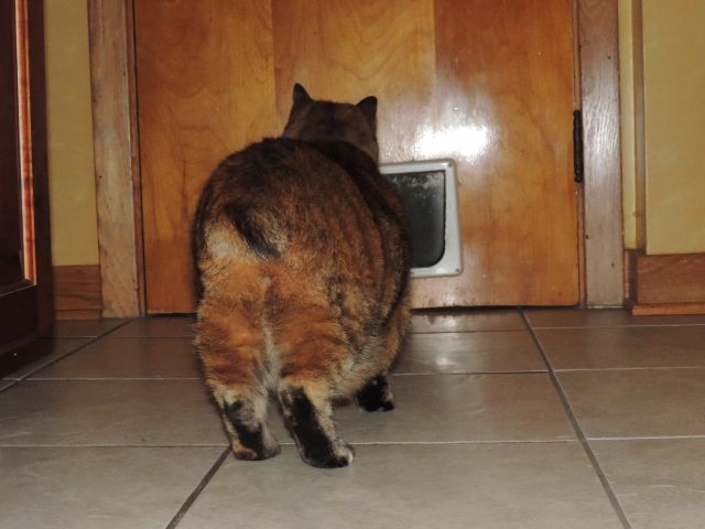 De eerste keer dat ik het poezenbeest zag, schrok ik van de omvang. “Everything is big in Texas” heb ik al eens op Lois geplakt, maar daar heb ik Lois tekort mee gedaan. Hier in Pennsylvania zijn de katten ook van mega-omvang. En dit geval is dan ook nog eens niet heel regelmatig – er zitten bobbels aan (vandaar ook de naam ‘Lumpy’ – ‘bobbelig’). En ze heeft ook geen staart meer. Ze is schijnbaar ooit aangereden door een auto, waardoor ze haar staart nu mist en haar bobbels erbij heeft gekregen. Sneu. Maar ik heb daardoor wel een mode-tip opgedaan: een staart kleedt af. Ik zie het verschil duidelijk! Wonder boven wonder, ze past wel door het kattenluik! (“bonk!”)