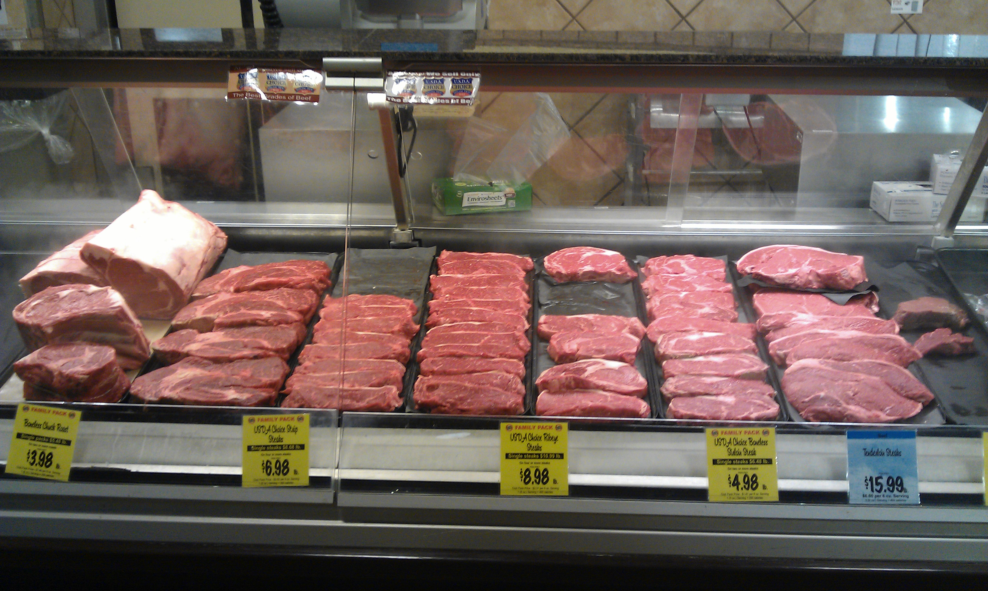 Wegmans heeft ook een enorme slagerij waar je naar wens iets kunt laten afsnijden en afwegen, een verse bakker (met vers brood, taarten, muffins… je kunt het zo gek niet verzinnen), een jaloersmakende visafdeling (waar je zelfs levende kreeften kunt krijgen) en een verse-sushi-bar, een kaasafdeling met ook buitenlandse kaas, een bloemisterij…