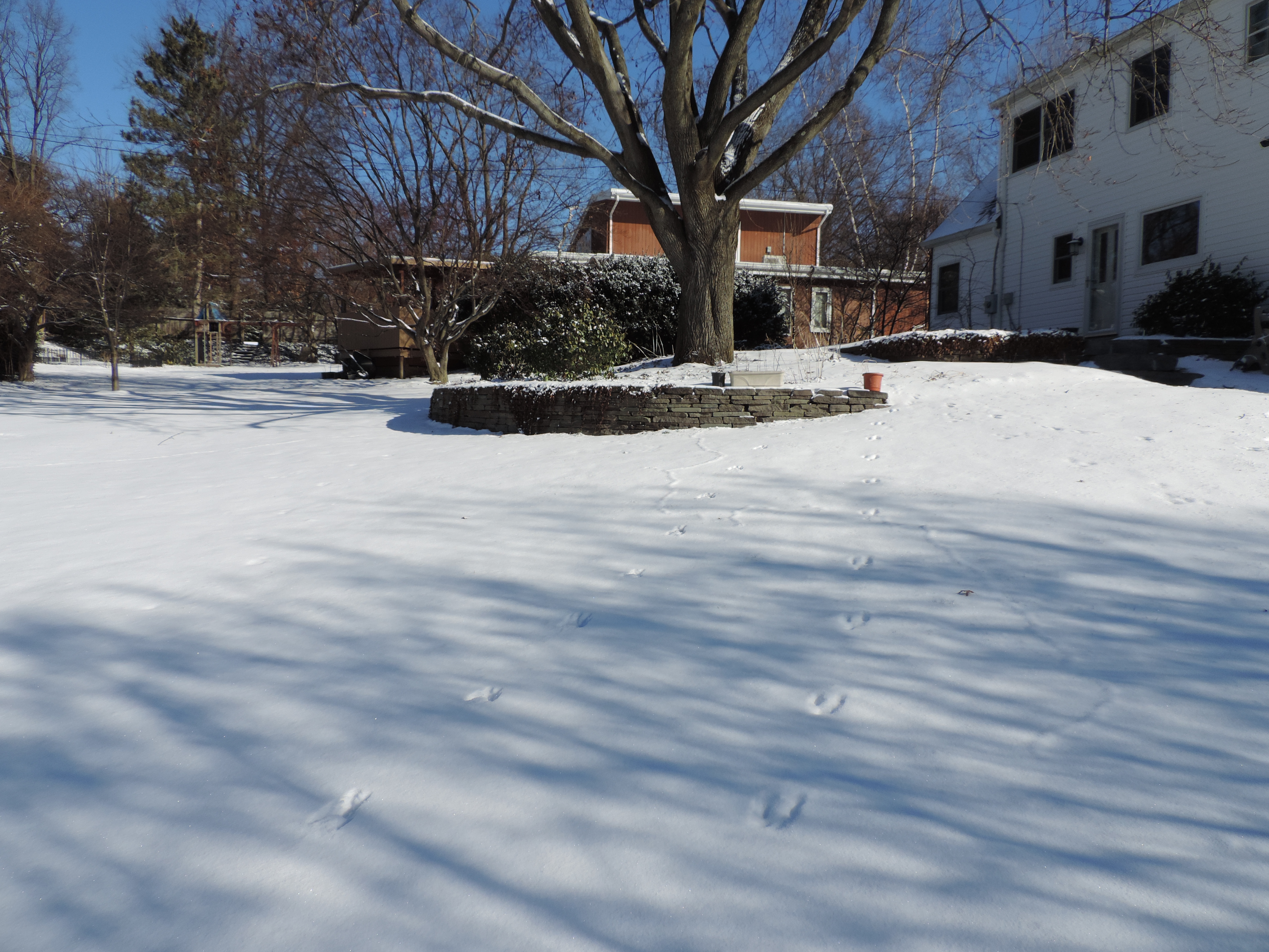 Toch ben ik teruggegaan, met camera. Want ik had een paar interessante sporen gevonden. Toevallig liepen die sporen naar de compostbak – eigenlijk niet zo raar, dat is nu eenmaal een plek waar eten te vinden is. Nu zijn Michiel en ik in Zuid-Afrika ‘getraind’ in sporen zoeken en identificeren (een erg leuke bezigheid), en dat wilde ik nu weer doen. Zeker in de sneeuw is het makkelijk te zien welke kant een beest oploopt. En hoe vers de sporen zijn (ik weet immers wanneer het gesneeuwd heeft). Moeilijkheid in dit geval is wel dat ik nog niet alle beesten ken die in Pennsylvania rondlopen…