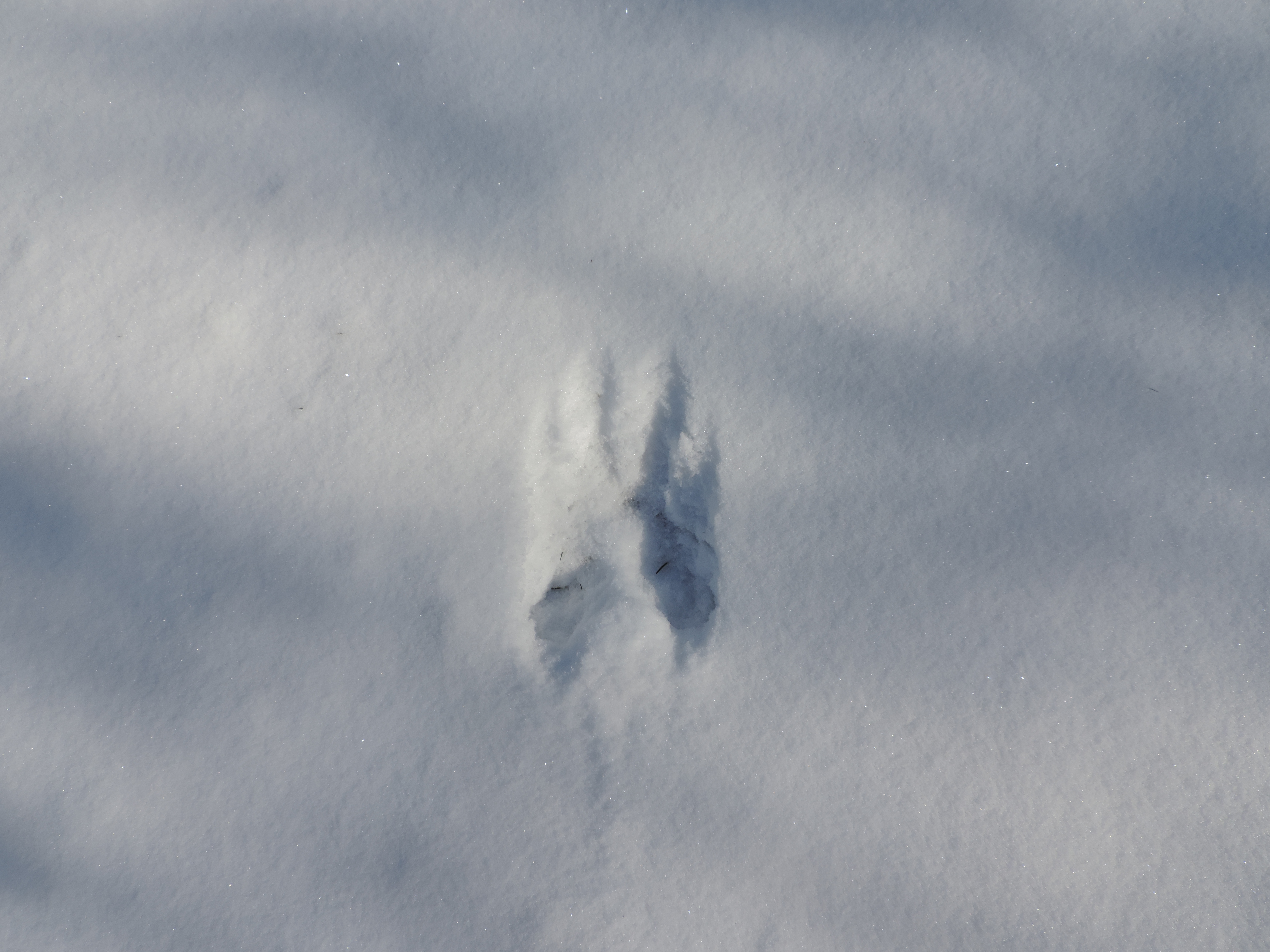 4) Het andere spoor heeft vier tenen (met ‘nagels’) en een ‘kussentje’ middenin. Totaal zo’n 8 cm lang. Het is geen katachtige, want die trekken hun nagels in tijdens het lopen. Het is dus een hondachtige (‘canine’). En aangezien het enorm grote poten zijn, lijkt het een coyote te zijn. Ook de positie van de sporen onderling duidt op een coyote – een lange streep, een hond maakt meer bochten. En ja, ook de coyote (een soort kleine wolf) komt hier voor, heb ik op de website van de Wildlife Association van Pennsylvania gezien. Zo’n beest eet – naast vlees – ook echt groente en fruit, en vindt mijn compostbak vast interessant. In vergelijking met de snowshoe hare is de coyote ook een stuk enger, en niet iedereen zal mij gelijk geven omdat ze hier nog nooit een coyote hebben gezien… maar ik ben er toch 80% zeker van na mijn zelfstudie dat ’t een coyote is geweest.