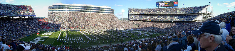 Ergens werkt het wel goed voor de eenheid van een universiteit, zo’n grote sportcomponent. Het levert merchandise mogelijkheden op, het draagt bij aan het imago van de universiteit, en studenten zijn tot in lengte van dagen supporter van die universiteit. Dat is ook de reden dat PSU zo’n ontzettend groot football stadion heeft. Beaver Stadium heeft niet minder dan 106.572 zitplaatsen. Daarmee is het op een na grootste sportstadion in Amerika. Het is groter dan Camp Nou in Barcelona (98.603), groter dan Wembly (90.001) en veel groter dan de Arena (53.052).
