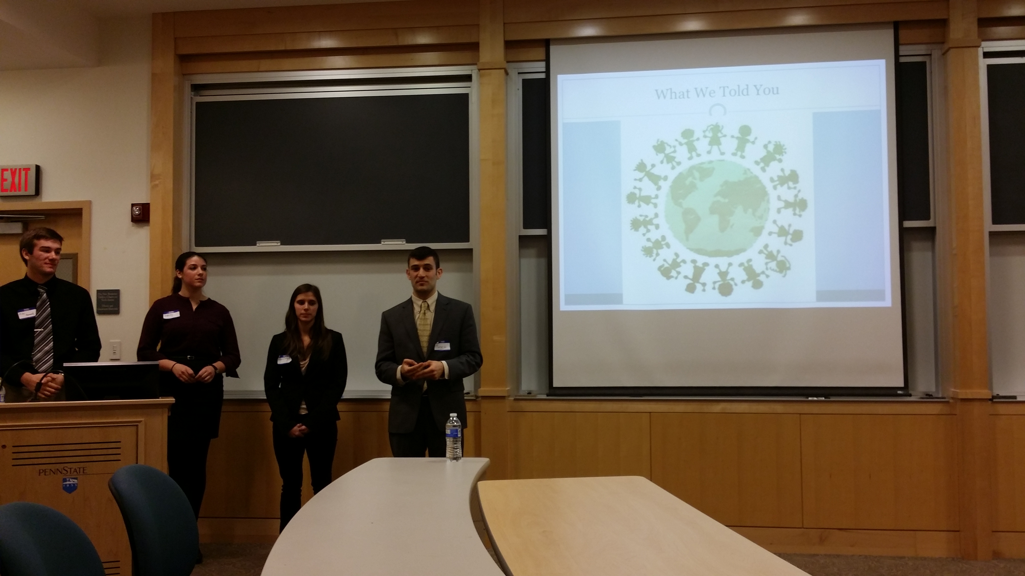 Deze dag had ik echter een buitenschoolse activiteit: ik was gevraagd om te jureren bij een studentenconferentie van de PSMA, de Penn State Marketing Association. Die hadden vandaag een case-wedstrijd in het kader van ‘sustainability’ georganiseerd. En omdat ik het vak 450W Marketing Strategy geef, dat grotendeels gebaseerd is op case analyses, hadden ze mij – last-minute – gevraagd om deze zaterdag in te vallen. Tuurlijk! Ik doe dat graag voor deze studentencommunity.