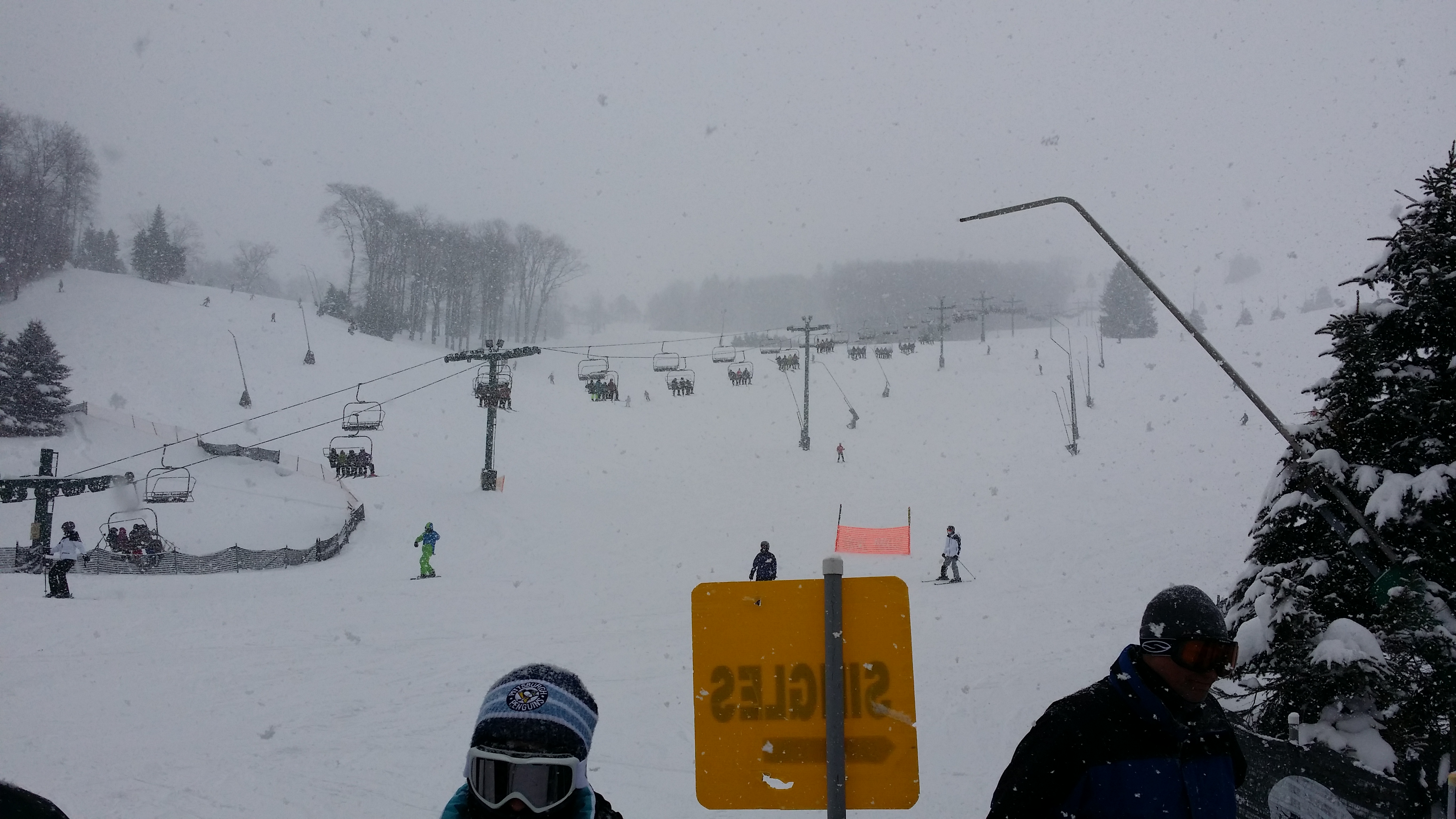 We zijn naar Seven Springs geweest, een redelijk groot skigebied op ietsje meer dan twee uur rijden van State College. Met 11 liften en 33 afdalingen, waarvan een groot aantal best pittig. Ze hebben hier een andere klassificatie dan dat wij kennen. Ze hebben hier ‘groene rondjes’, dat zijn zeer simplee groene pistes. Dan hebben ze vierkante blauwe pistes, dat zijn onze ‘blauwe’ pistes. Dan gaan ze meteen over op zwarte diamanten, dat lijkt het meest op onze rode pistes. In andere skigebieden hebben ze nog ‘double diamonds’ en ‘triple diamonds’, en dat zijn onze moeilijkste, allerzwartste pistes. Maar die hebben ze niet in Seven Springs.