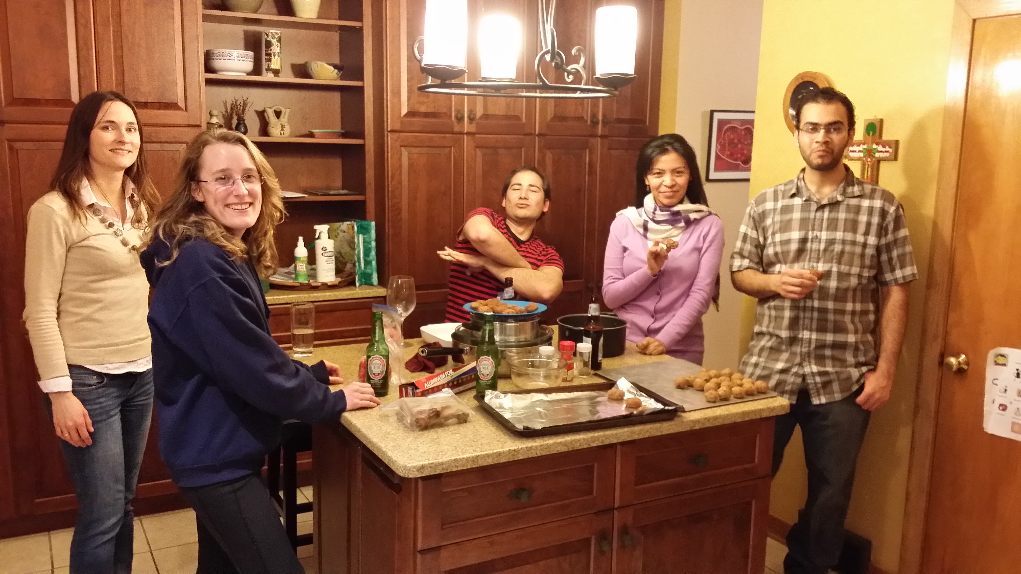Het idee kwam van Manny, Jari en mij. Manny ken ik via Veronica en heb ik nu al wat vaker gezien, afgelopen donderdag nog bij Veronica’s verjaardag. Jari ken ik via Manny – hij was bijvoorbeeld ook mee op onze roadtrip naar Niagara Falls. Veronica was er ook. Dan nog Rebecca, die ook mee was naar de Niagara Falls. En Jana, de visiting scholar op het department. Mijn eettafel (en mijn servies) kan net zes personen aan, dus het was precies goed!