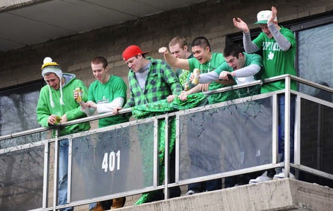 Daar waar ik zaterdag een zeer rustige dag had, was het voor de studenten de Mooiste Dag van het Jaar, als ik ze mag geloven. Want het was State Patty’s Day, en dat behoeft enige uitleg. Hier in Amerika is Saint Patrick’s Day een belangrijke feestdag. Dat is eigenlijk een Ierse, katholieke feestdag, die vanwege het deel Ierse immigranten is verworden tot een verkleed-je-in-het-groen-en-drink-groen-geverfd-bier-dag. Dat past natuurlijk heel erg prima bij het studentenleven. Alleen, Saint Patrick’s Day valt regelmatig in het Spring Break Weekend (dat begint over een week) en veel studenten zijn dan niet in State College. En dus werd ze een “drinking holiday” door de neus geboord.