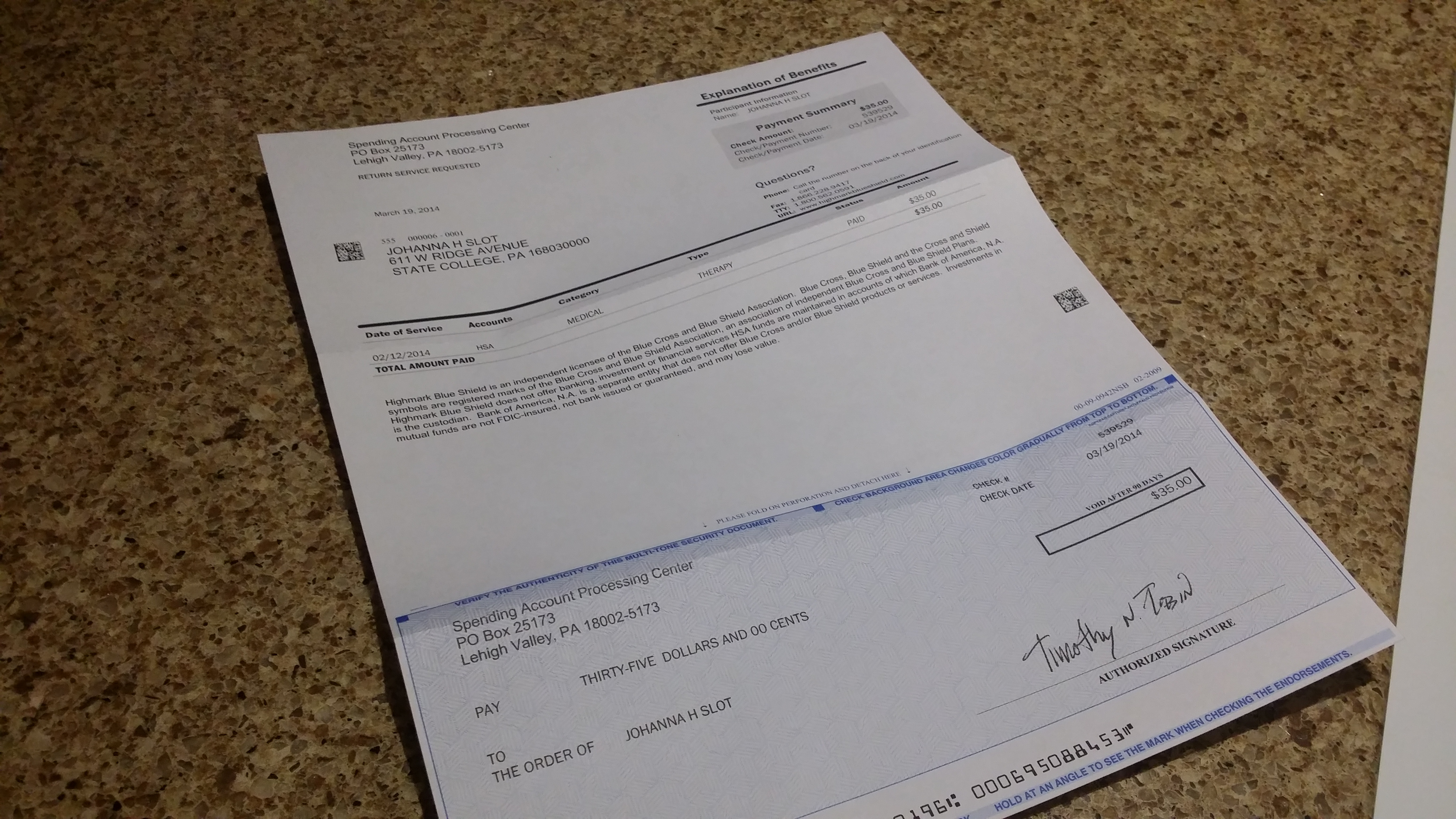 Vandaag heb ik een cheque met de post gehad. Dat is een primeur. Ik heb inmiddels al wel een paar keer een cheque uitgeschreven, daarvan weet ik inmiddels wel hoe het gaat. Die vul je in, en die stuur je gewoon op met de post (en dan zoeken ze het maar verder uit). Maar nu kreeg ik er zelf eentje – de zorgverzekering heeft me 35 dollar terugbetaald die ik heb voorgeschoten (dat verhaal staat hier). En ja, wat dan?