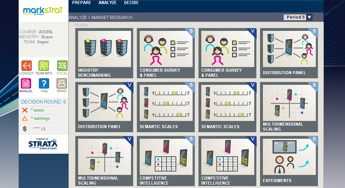 Veel van deze dingen kun je uit de losse pols bepalen, maar MarkStrat biedt ontzettend veel mogelijkheden om erachter te komen wat wijs is en wat niet. Er zitten ontzettend veel informatiebronnen in de simulatie: financiële gegevens van het bedrijf, marktgegevens, informatie over concurrenten, etc. Er zit zelfs ‘marktonderzoek’ – daarvoor moeten studenten dan wel budget opzij zetten, maar dan krijgen ze bijvoorbeeld informatie van consumentenpanels, of een conjointanalyse (die laatste is wat ingewikkeld om uit te leggen, maar is vooral handig bij het bepalen van de karakteristieken van nieuwe producten).