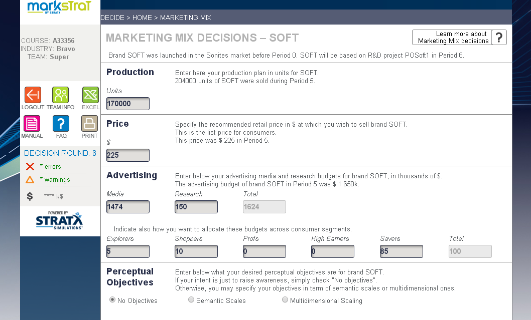 Binnen MarkStrat moeten de studenten een hoop beslissingen nemen. Ze krijgen om te beginnen een marketingbudget, en daarbinnen moeten ze van alles bepalen voor de (bij de start) twee Sonite-merken die ze moeten managen: