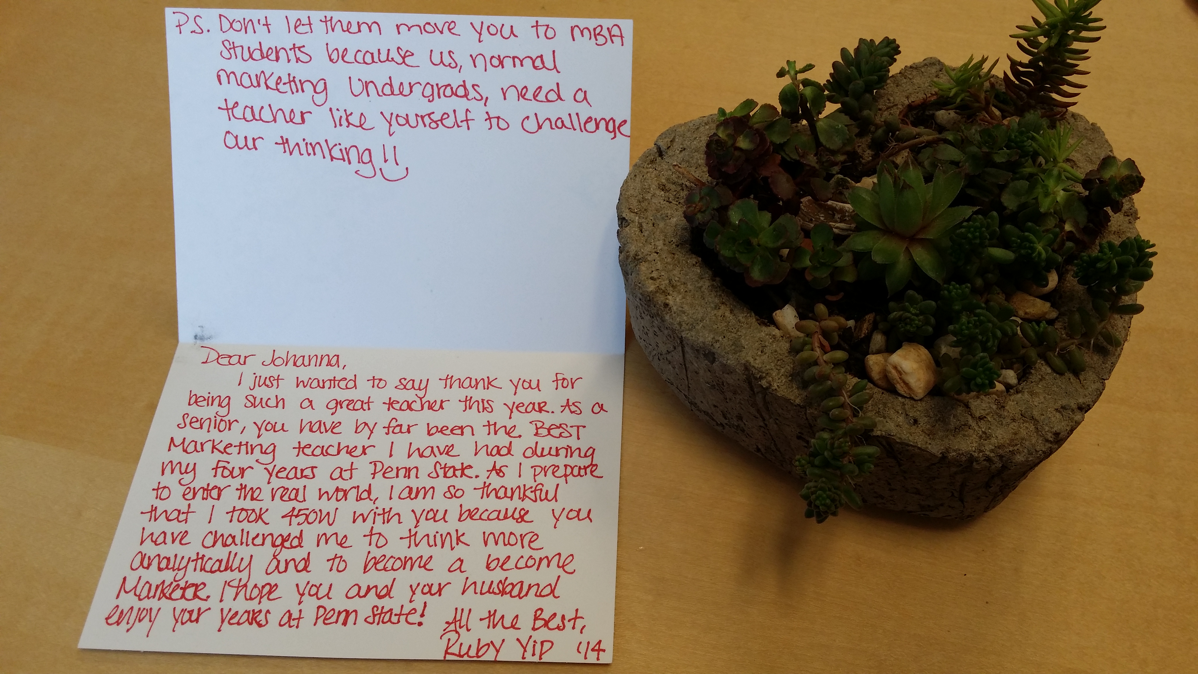 Om de boel een beetje te balanceren: ik heb ook een student op kantoor gehad die me geen energie kostte, maar die mij energie gaf, Ruby. Ruby kwam mij een plantje brengen voor op kantoor (cadeautje), en een kaart. Ze vertelde me (en dat stond eigenlijk ook op de kaart) dat ik de beste marketing docent was geweest die ze in al die jaren op Penn State had gehad… Ik ben dan wel streng, vond ze (“maar dat is ook goed, wij zijn seniors”), maar door het doorvragen en discussiëren in de klas heeft ze analytisch leren denken, en dat had ze nog niet eerder meegemaakt, vertelde ze. Nou, daar werd ik wel even stil van… Ze zei dat ze me ontzettend ging missen en dat ze mij nooit zou vergeten – ze stond letterlijk in tranen voor me op kantoor…