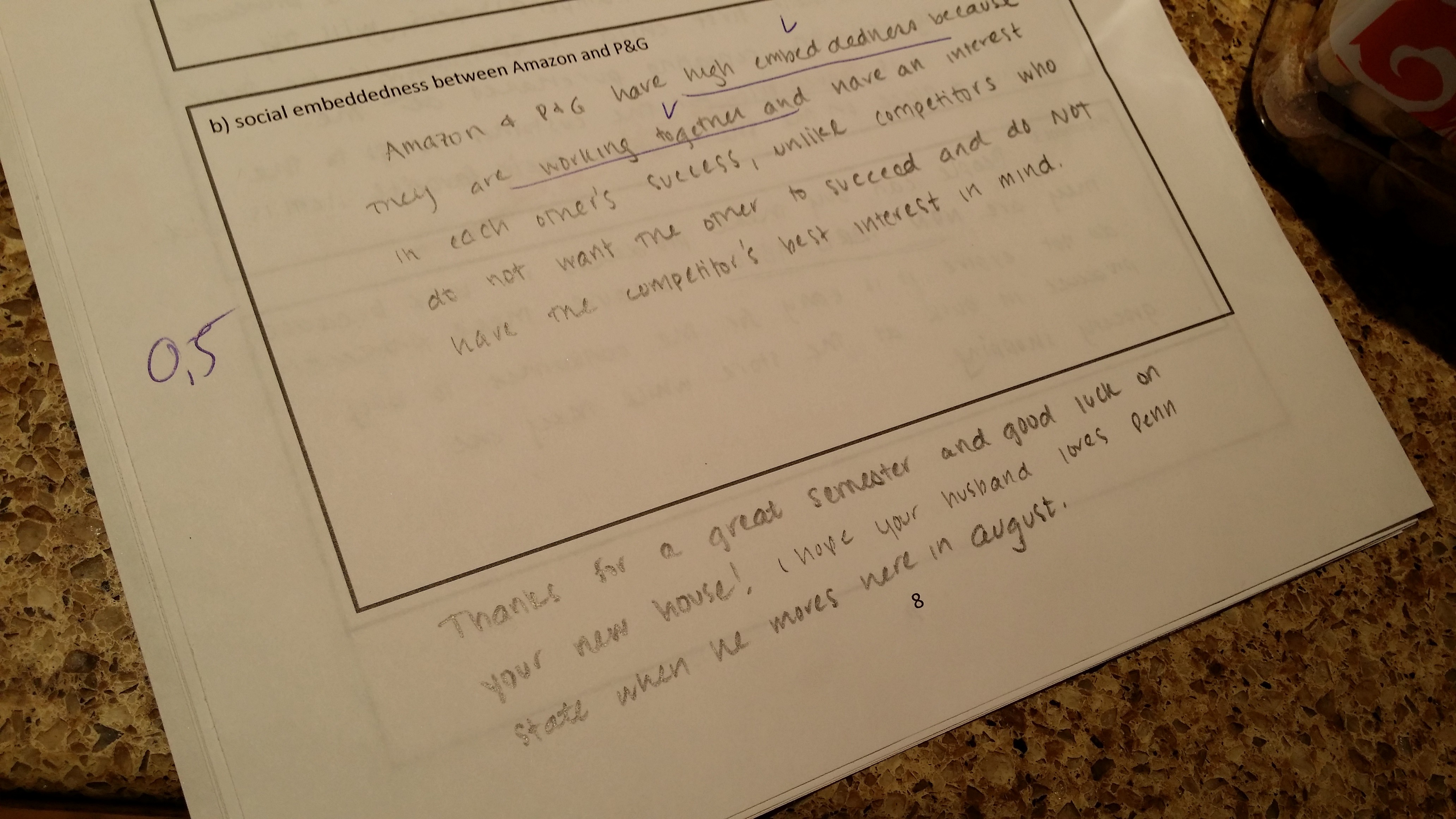 Het is mooi als studenten je bij het inleveren van het (toch niet eenvoudige) tentamen geluk wensen (“Succes met je huis!” en “Hopelijk vindt je man het ook tof hier!”) en complimenten geven (“Dank je ontzettend voor de cursus!” en “You are awesome!” en “Will you be at trivia again this Thursday Professor?” – dat laatste blijft leuk… ik moet volgend jaar maar weer een trivia-studententeam in mijn cursus hebben, vind ik!).