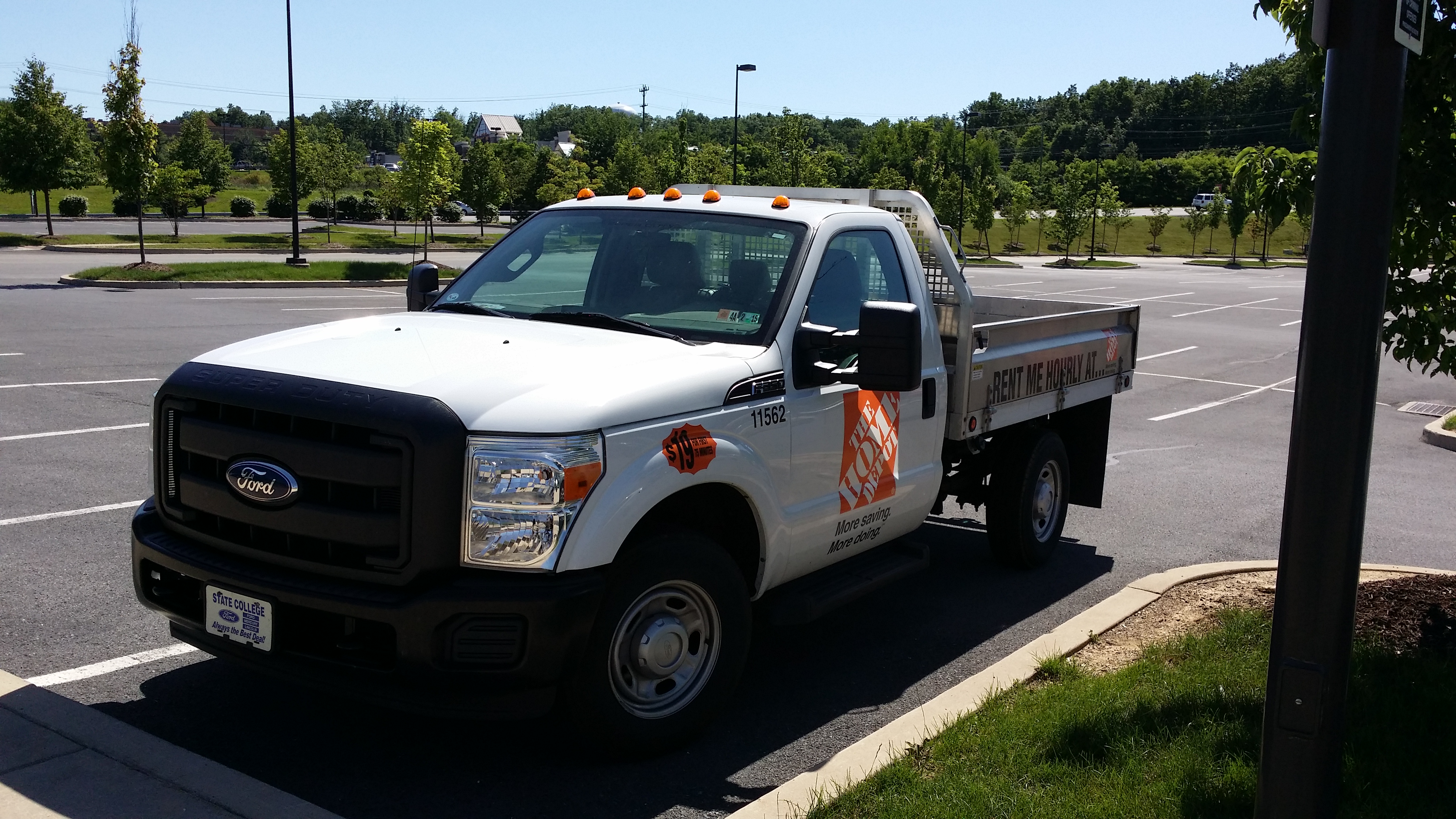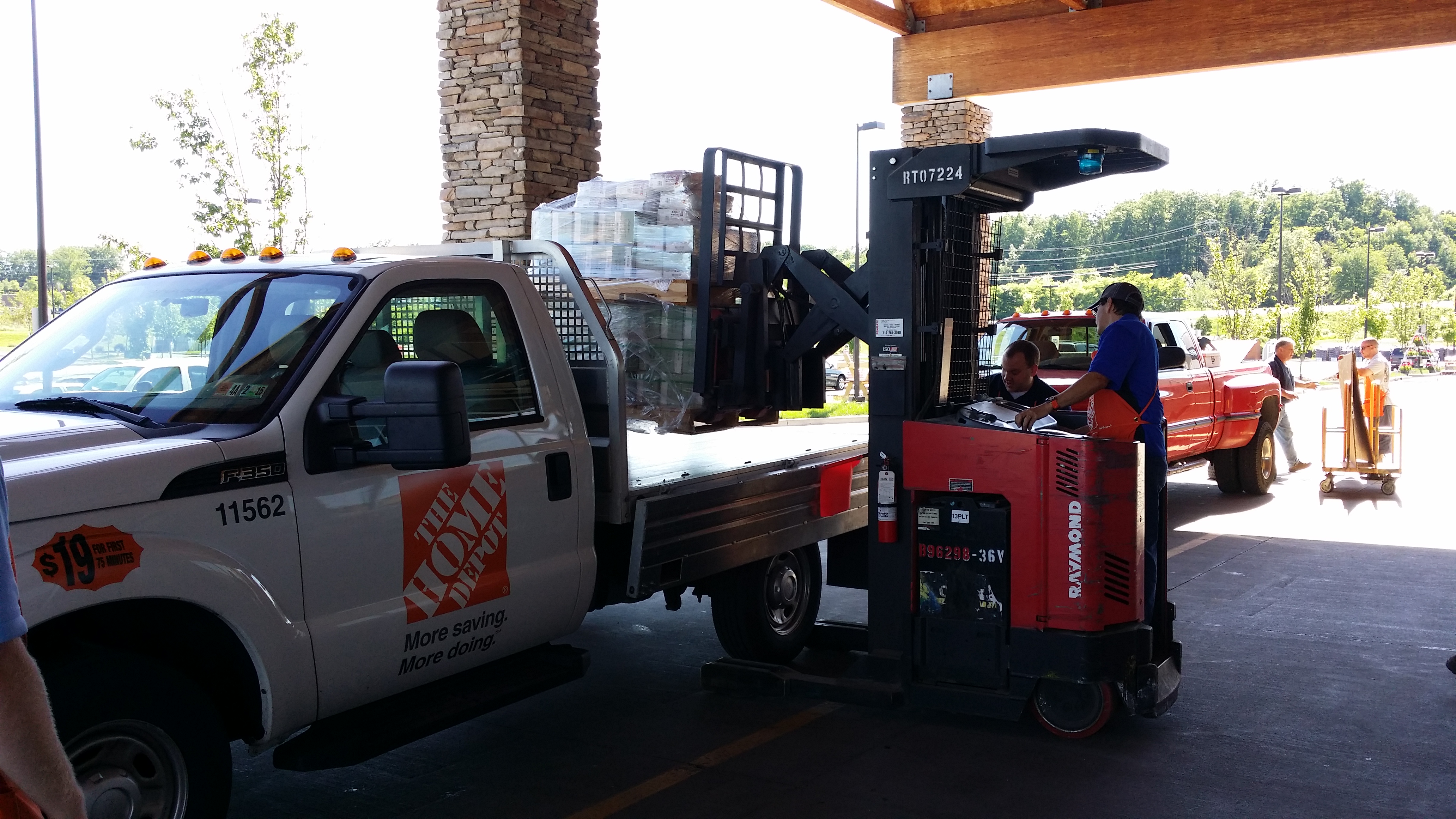 Ik had daarmee 41 dozen (van de benodigde 52) van per stuk 50 pond (23 kilo, zeg maar een vliegtuigkoffer op maximaal gewicht). En een grote doos met een barbecue er in. En 7 zakken voegmiddel. Hoe kreeg ik die op Old Farm Lane? Home Depot verhuurt voor 25 dollar per 75 minuten een ‘truck’ (zo’n Amerikaans geval, Ford met grote laadbak). Home Depot medewerkers hielpen me met inladen van de tegels (middels heftruck) en de barbecue. Maar ja, hoe krijg je dat in je uppie er weer uit?