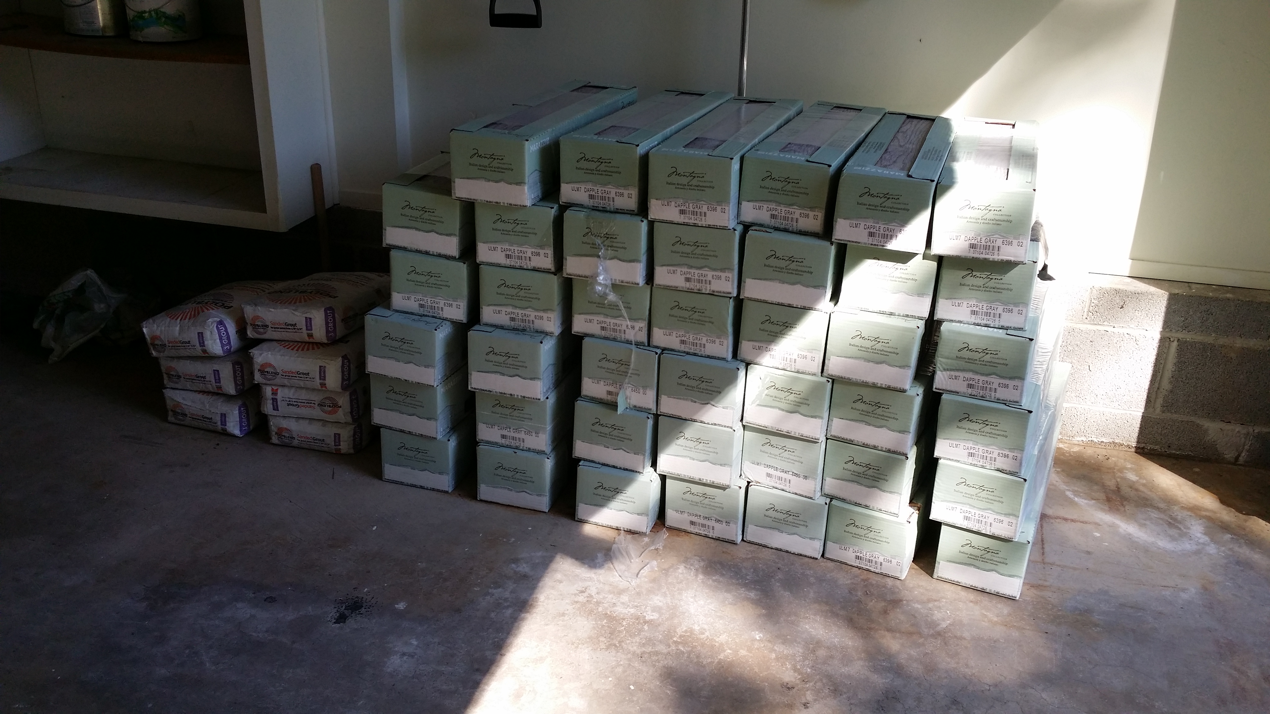 Er staan inmiddels 52 pakken tegels in de garage (dit zijn er 41)