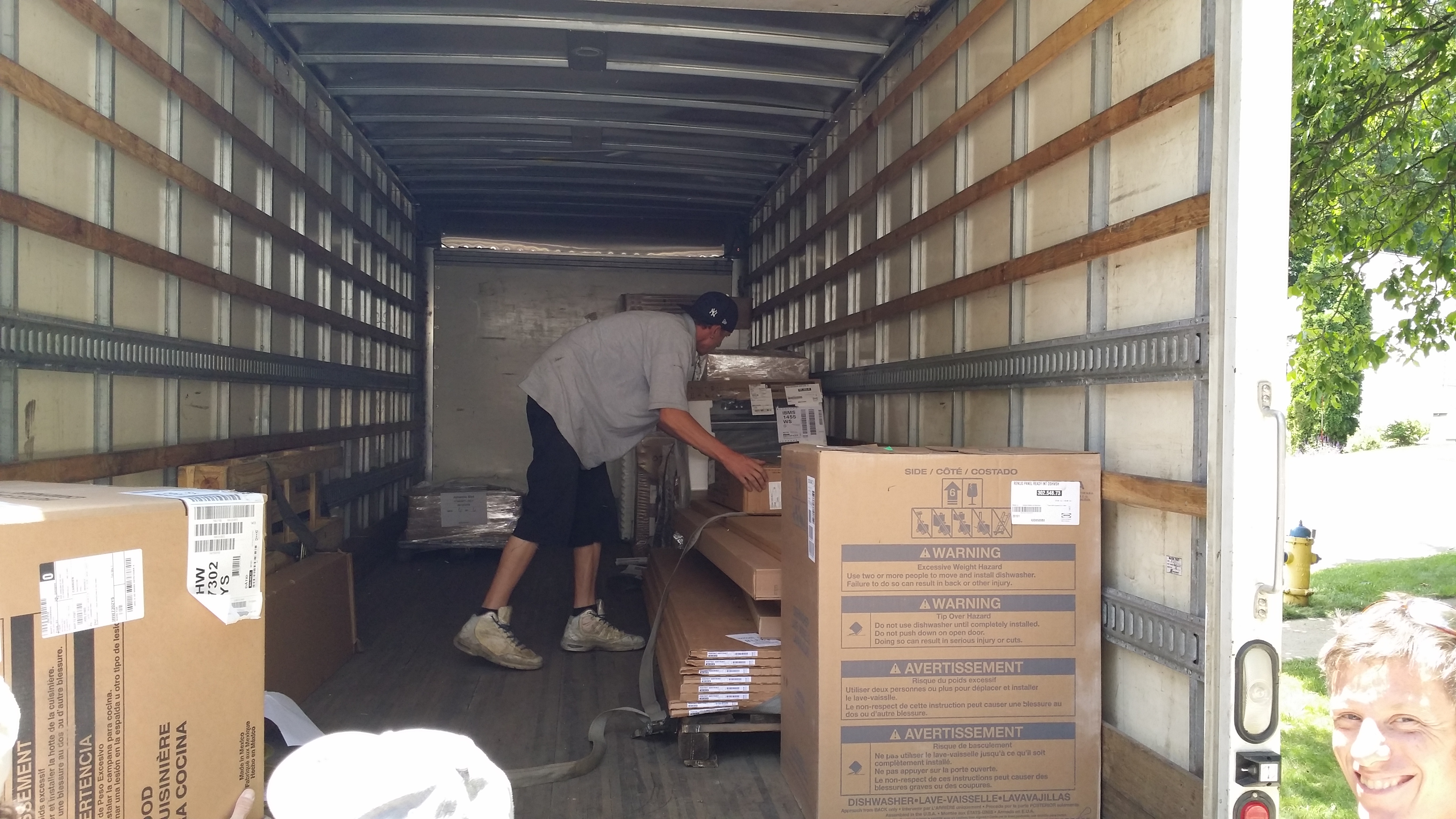 Maar goed, ik was weer bijgekomen en klaar om de keuken in ontvangst te nemen. De vrachtwagen draaide achteruit de oprit op, de laadklep ging open… en de chauffeur zei: “Ik hoop dat je wat ruimte hebt, want dit is allemaal voor jou!” Zes pallets vol met IKEA dozen. Ga er maar aan staan. Is even werk om uit te laden. Gelukkig hielpen mijn bouwvakkers – anders hadden de bezorgers het spul op de stoep neergezet – en werd alles netjes binnengedragen. Zo ook de koelkast van een dikke 120 kilo. Hoe had ik dat anders voor elkaar gekregen? Soms helpt het als je de ‘damsel in distress’ (vrij vertaald, ‘vrouw in nood’) bent… dan krijg je soms onverwachte hulp!
