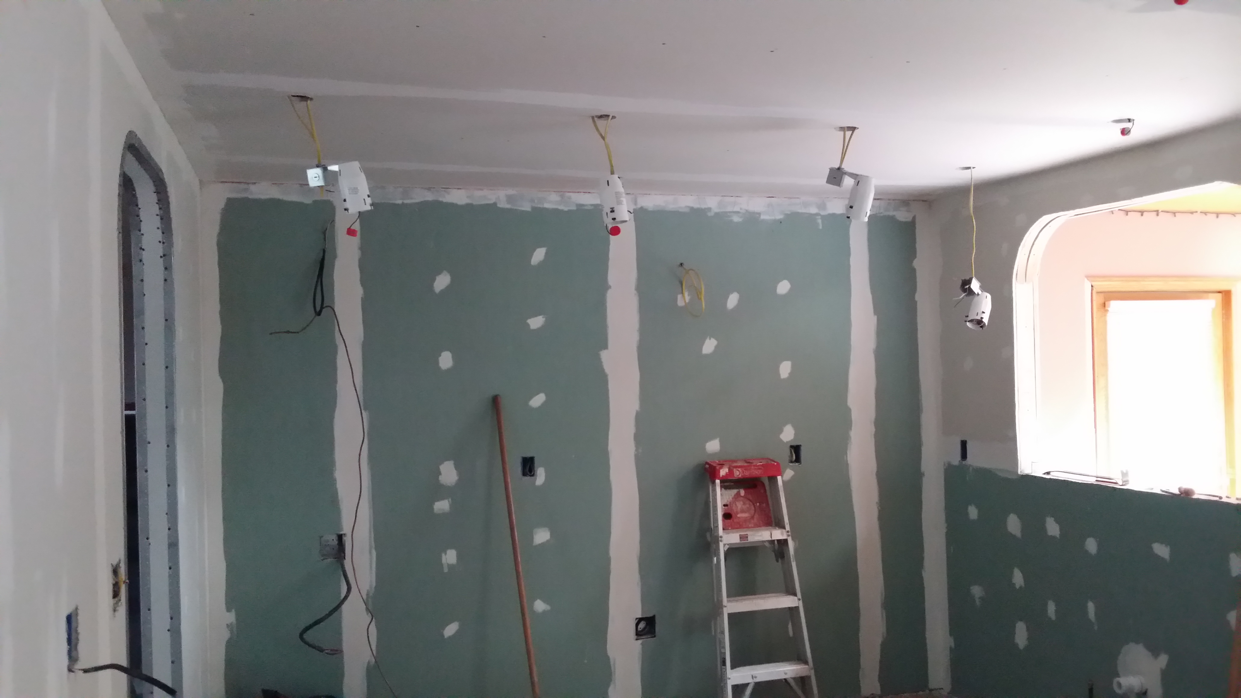 Nu alle electra, en wateraan- en afvoer is aangelegd konden de muren en de plafonds weer worden opgevuld met isolatiemateriaal. Vervolgens kwamen er weer gipsplaten voor. Gipsplaat is bouwmateriaal nummer 1 in America, hier heet het ‘drywall’, en het is in gigantische maten te verkrijgen. Dat is handig voor grote muren en voor plafonds. Nadat de gipsplaten vastgeschroefd zaten, zijn de naden, schroefgaten en oneffenheden opgevuld met ‘mud’: pleisterwerk.