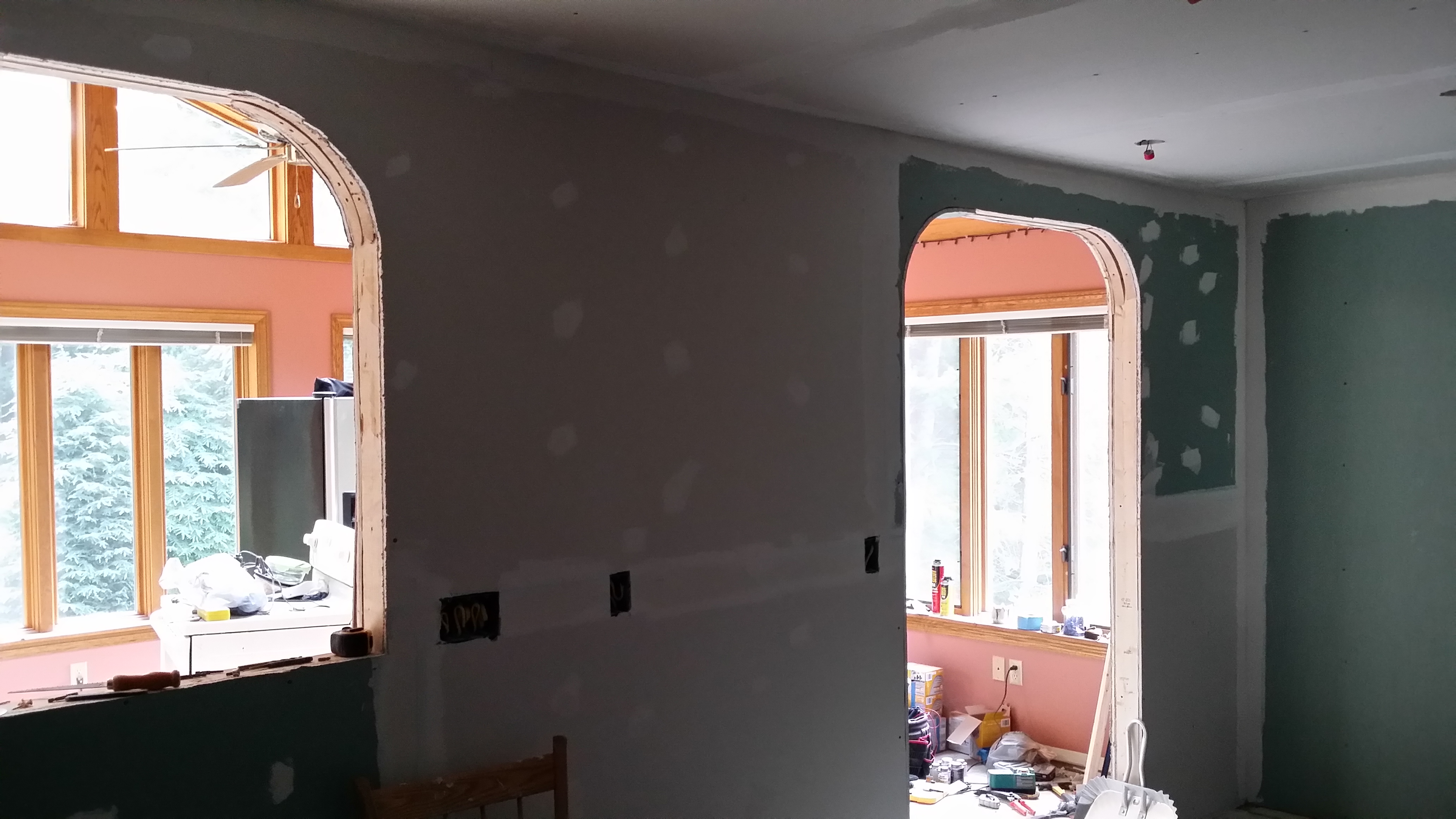Gipsplaat en pleisterwerk rond de nieuwe openingen in de keuken