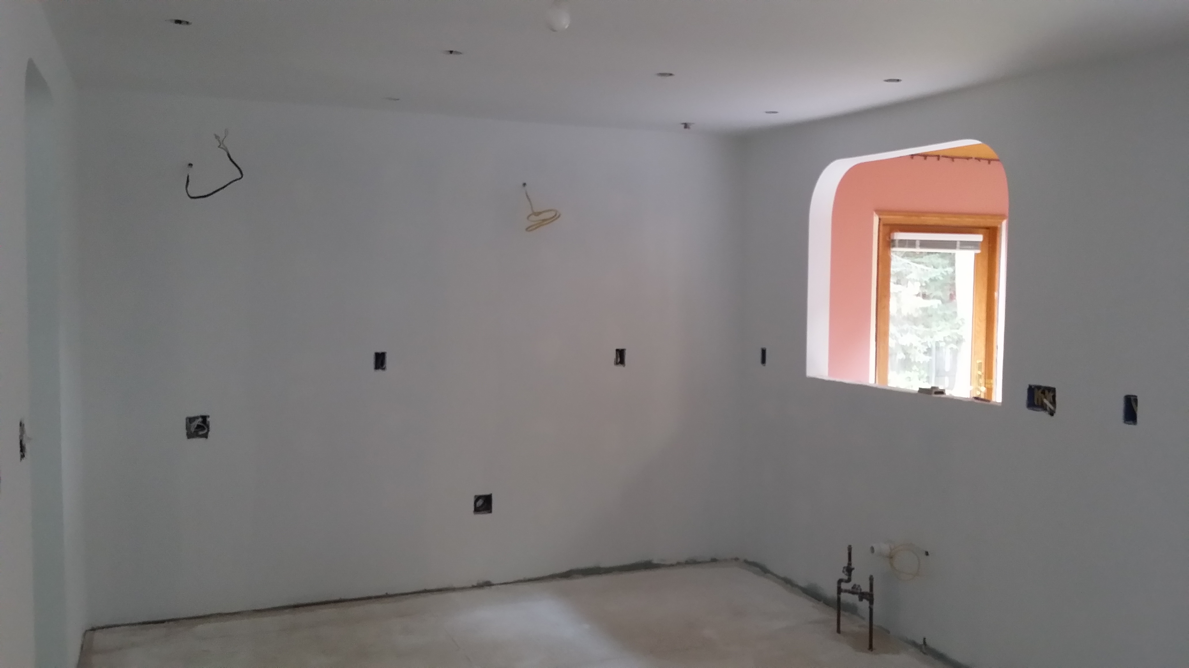 De keuken moet eerst geschilderd (plafond en muren), want dat is niet te doen nadat de keuken is geinstalleerd. Michael (de aannemer) had er eerst primer op gedaan (daar waar er nieuwe drywall op zit), waardoor het pleisterwerk keihard wordt. Daarna komt er de echte verf op. Die primer heeft ie er echt supersnel op gedaan: in 90 minuten de hele keuken en de halve woonkamer geprimed. Nou nou… in dat geval kan ie de echte verf ook wel doen!