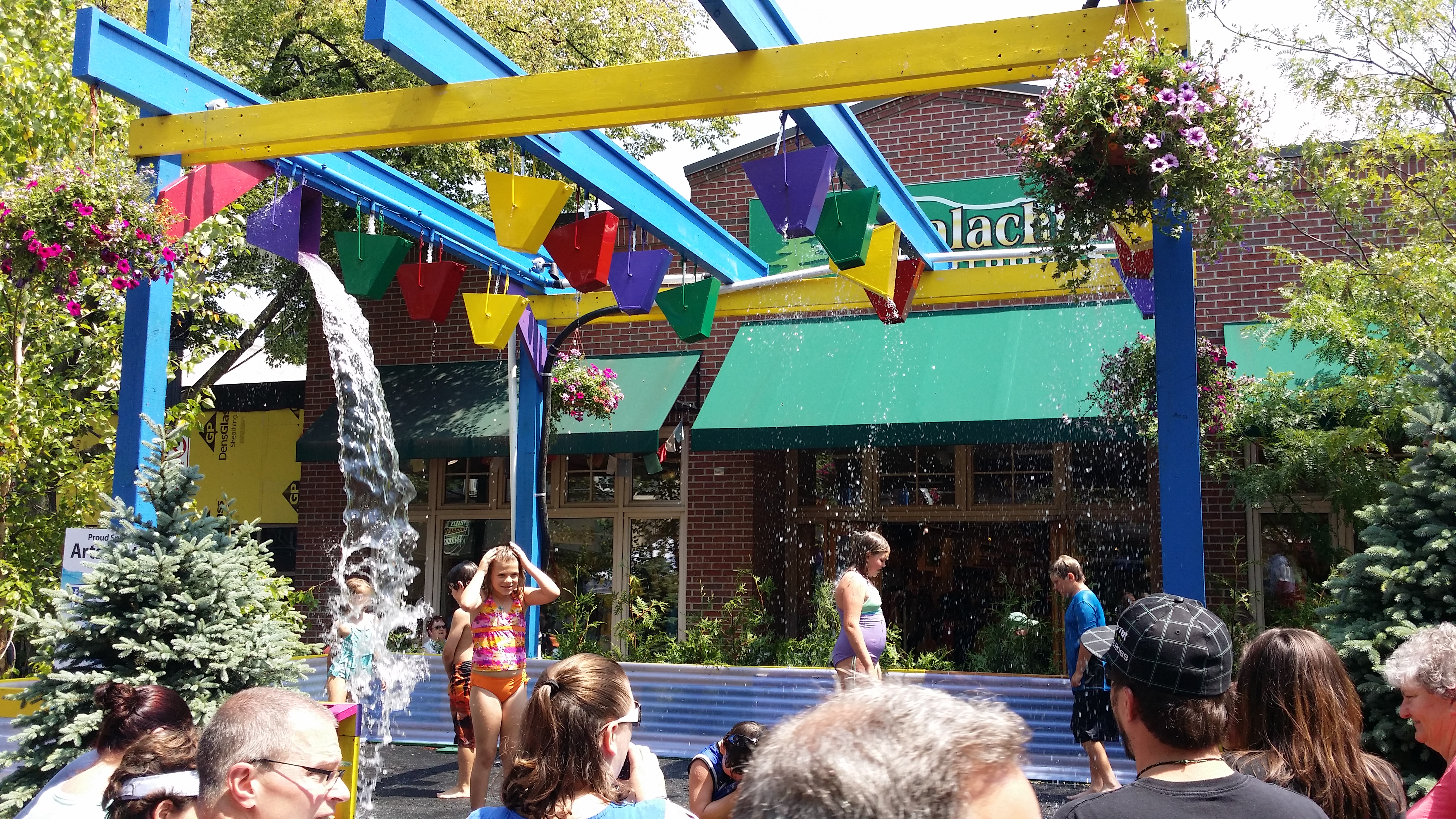 Afgelopen weekend was het superwarm hier tijdens het Arts Fest in State College. En daarom had de organisatie van het Arts Fest twee grote waterconstructies gebouwd: een miststraat, waarin ‘mist’ (de waterdruppels…) werd verspreid als je er doorheen loopt, en een installatie met emmers water die vallen als ze vol zijn. Vooral voor kinderen was dat een groot succes. Verder stonden er veel standjes met water, freshly squeezed lemonade en andere drankjes. En dat was nodig ook!