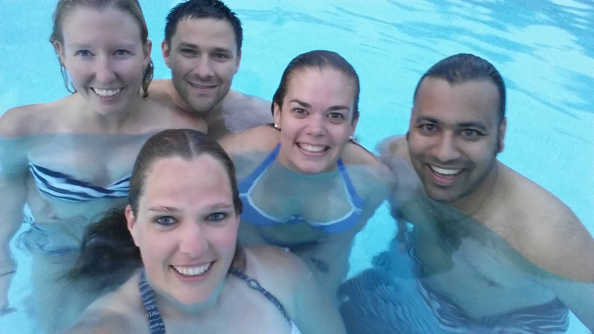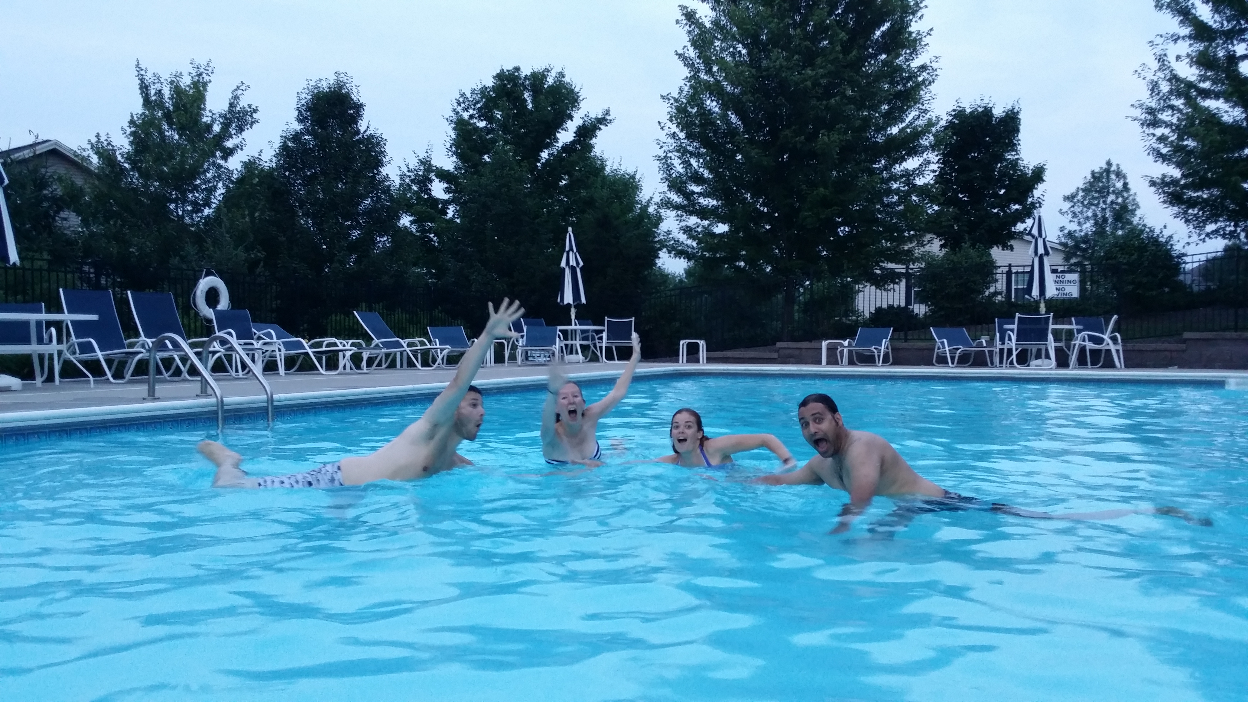 Nu zijn wij wat te oud om te gaan spelen met die vallende emmers. Daarom zijn wij na de voetbalwedstrijd zaterdag (gekeken bij Pranav op z’n big-ass-TV, gelukkig won Oranje…) na wat te hebben gegeten bij een Italiaans restaurant wezen zwemmen bij Chris. Zijn appartement ligt in een complex (Toftrees) dat een eigen zwembad heeft. Nog best groot ook, maar helaas niet zo diep. Toch was dat uurtje spetteren tijdens de zonsondergang superlekker en verkoelend!