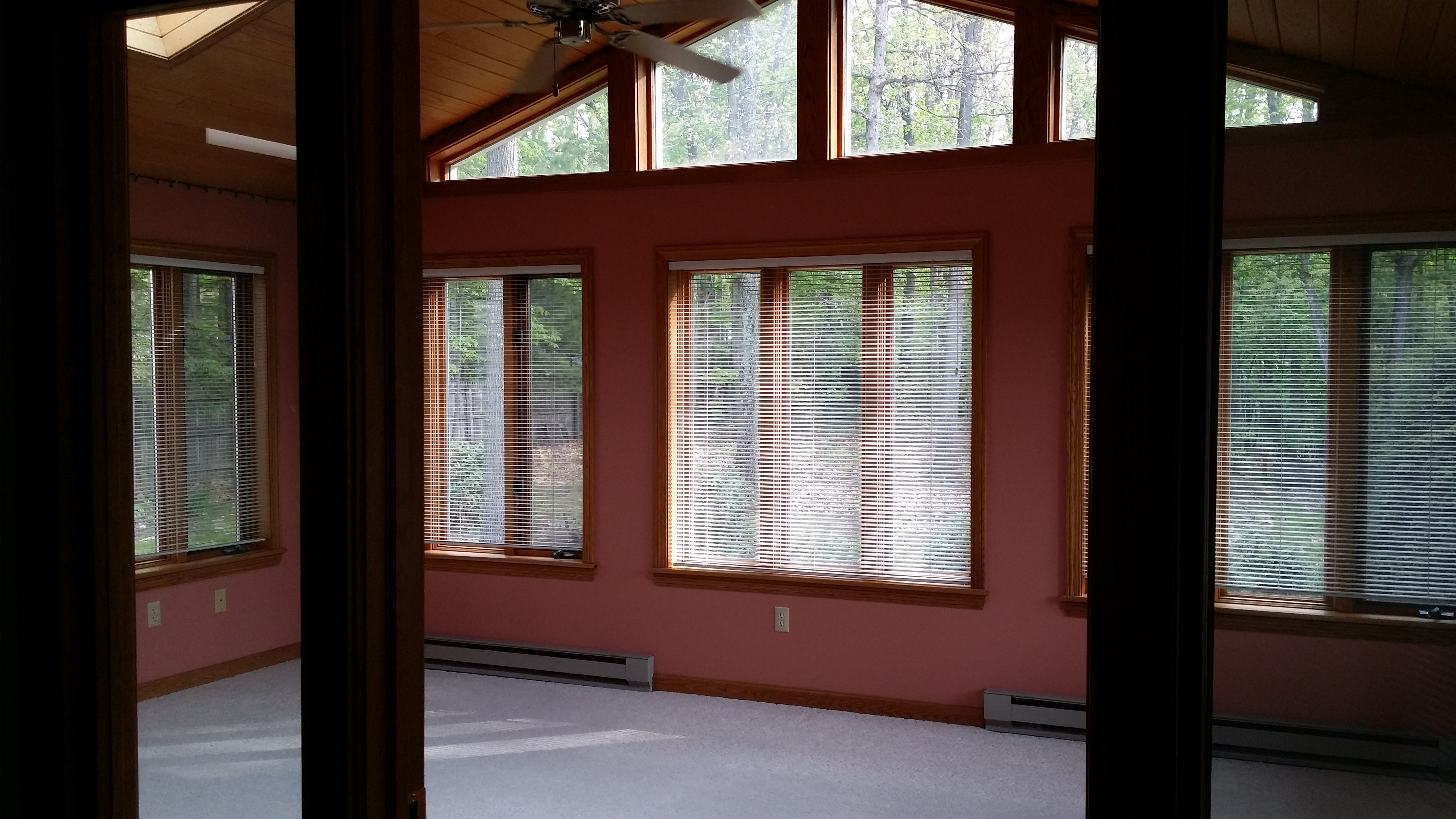Vooral de kleuren van de sun room stonden me erg tegen: hoe bedenk je het om je muren zalmroze te schilderen, en dan ook nog eens overal dat gele eikenhout? En waarom in godsnaam zou je kerstboomlampjes rond het plafond ophangen? (NB: dat gele eikenhout zat ook in het huis in Leusden – dat is echt het allereerste dat we destijds hebben overgeschilderd). En ja, die ouderwetse meubels helpen dan niet. En (echt waar), de geur van het huis stond me ook niet zo aan (“doorheen kijken/ruiken, Johanna… doorheen kijken!!”).