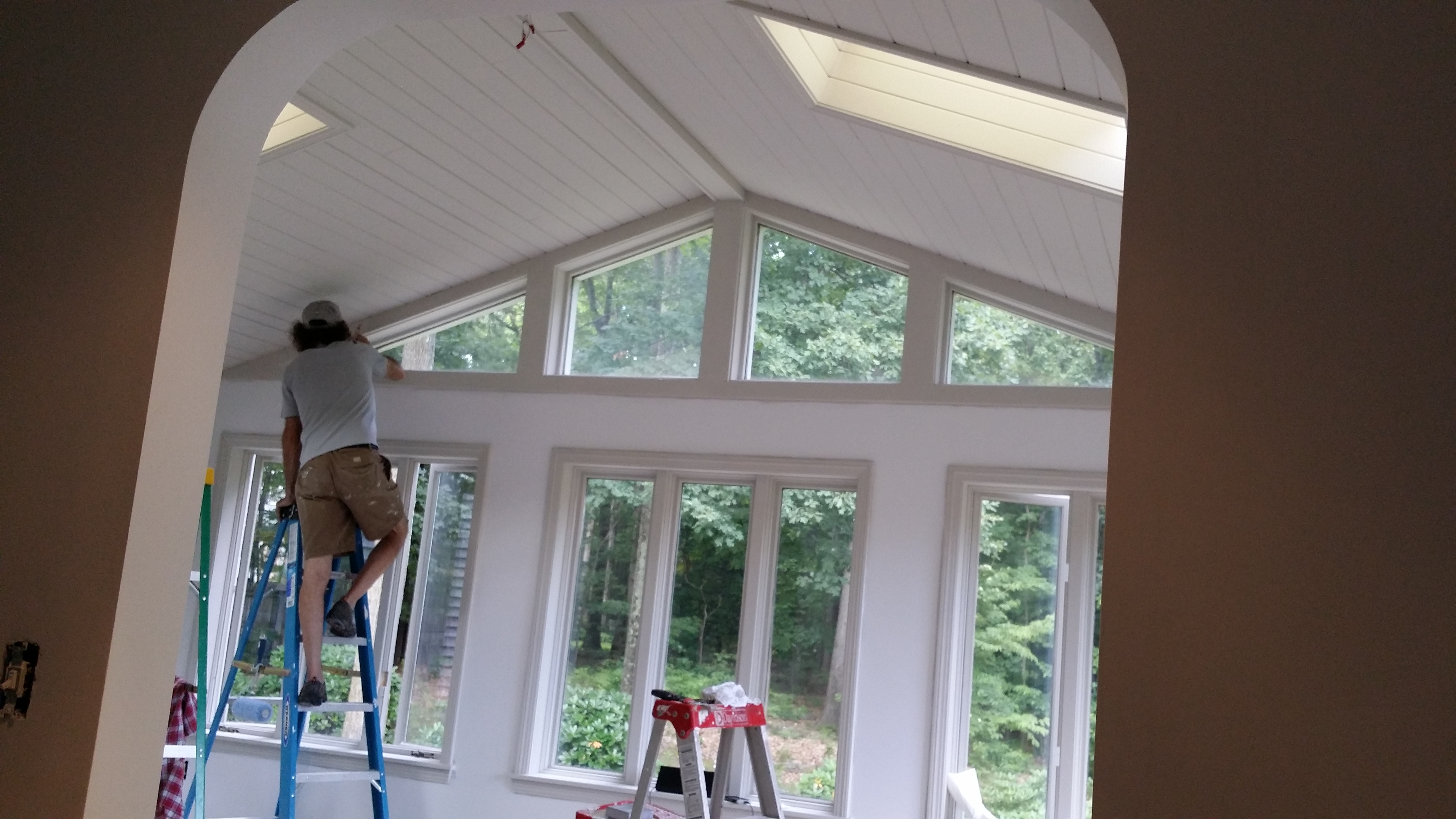 Oh wat was ik gisteren in mijn nopjes. De eerste laag ‘echte’ verf zit in de sunroom… en wat ziet het er meteen beter uit!! Tijd voor een VOOR en NA (nou ja, tijdens…) foto!