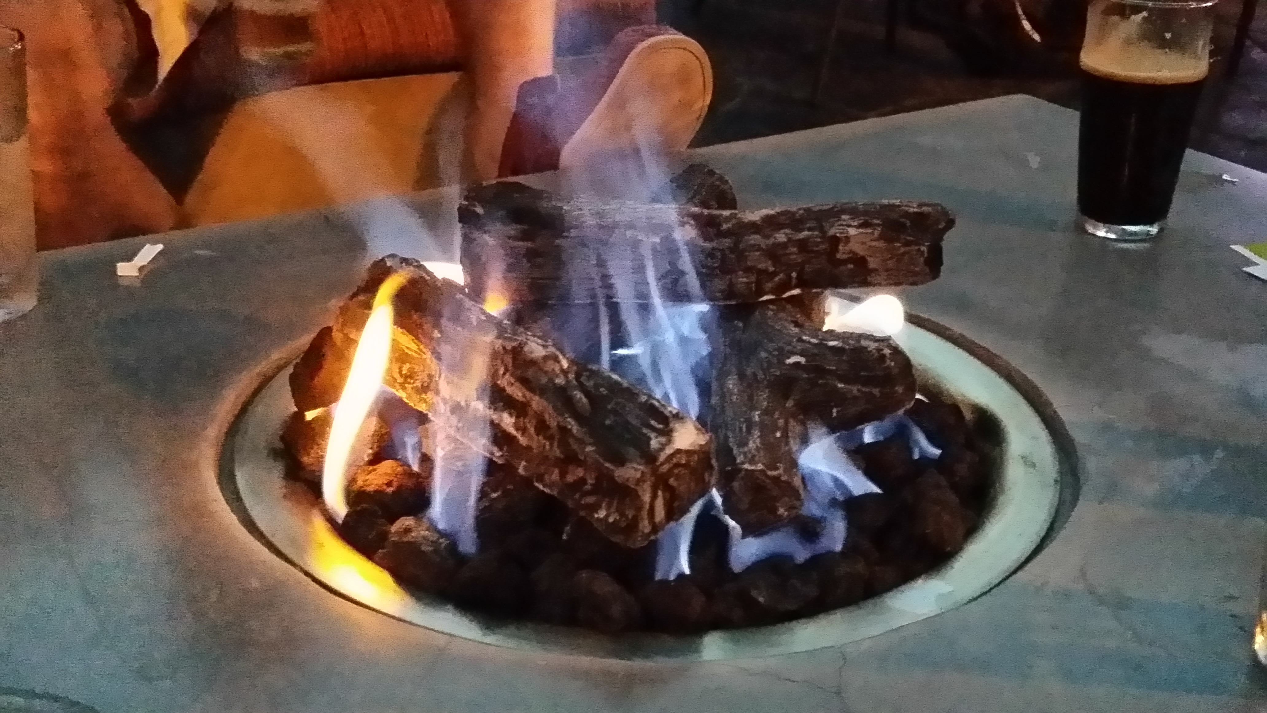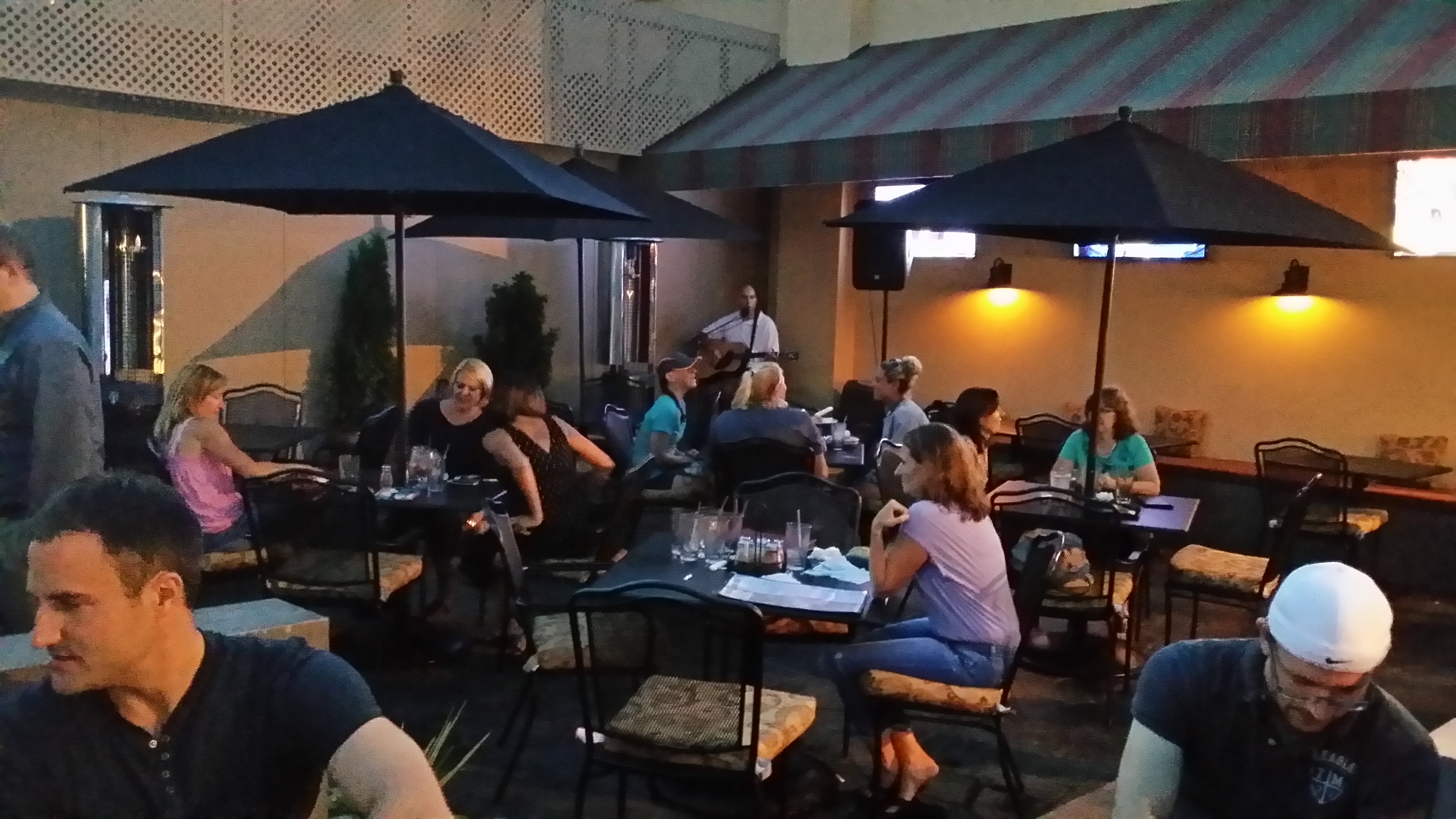 Het was een unicum: hier in State College zit zowaar een restaurant met een terras (dat heet hier een ‘patio’)! Met haardvuur, en banken met kussens. En er was ook nog livemuziek: een gast op een gitaar die nog prima kon zingen ook. Hier en daar wat vuurvliegjes erbij. En een salade… mijn avond was goed!