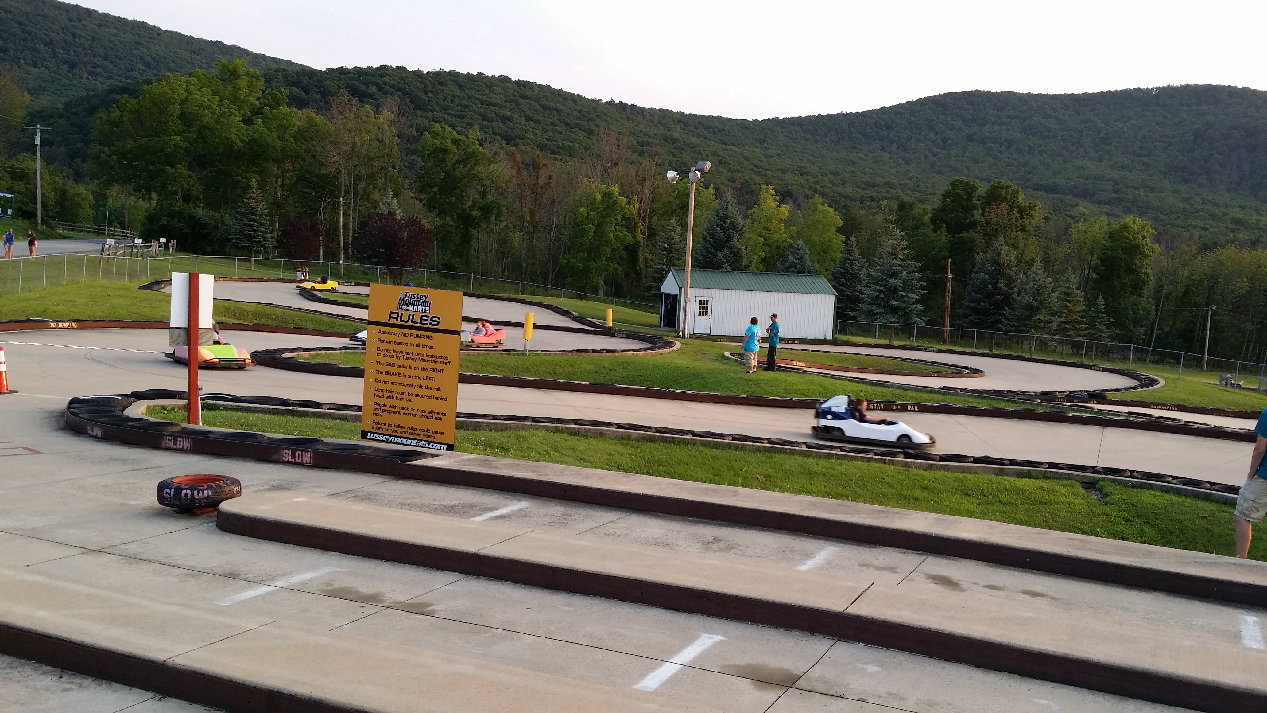 Pranav en ik hadden het er eerder die week al over gehad: je kunt karten op Tussey Mountain en dat gaan we een keer doen. Vrijdagavond was het zover. Pranav, Michiel en ik, en Peter zijn naar Tussey Mountain gegaan. Daar is in de winter een skipiste (niet zo heel hoog hoor), en in de zomerperiode kun je er onder andere karten. Leek ons superleuk. En dat was het ook. Met z’n vieren is het leuker dan met z’n tweeen – dan kun je elkaar tenminste grondig in de weg zitten. De karts gingen niet zo hard, en het parcour liet weinig inhalen toe, maar de hele ervaring was echt tof.