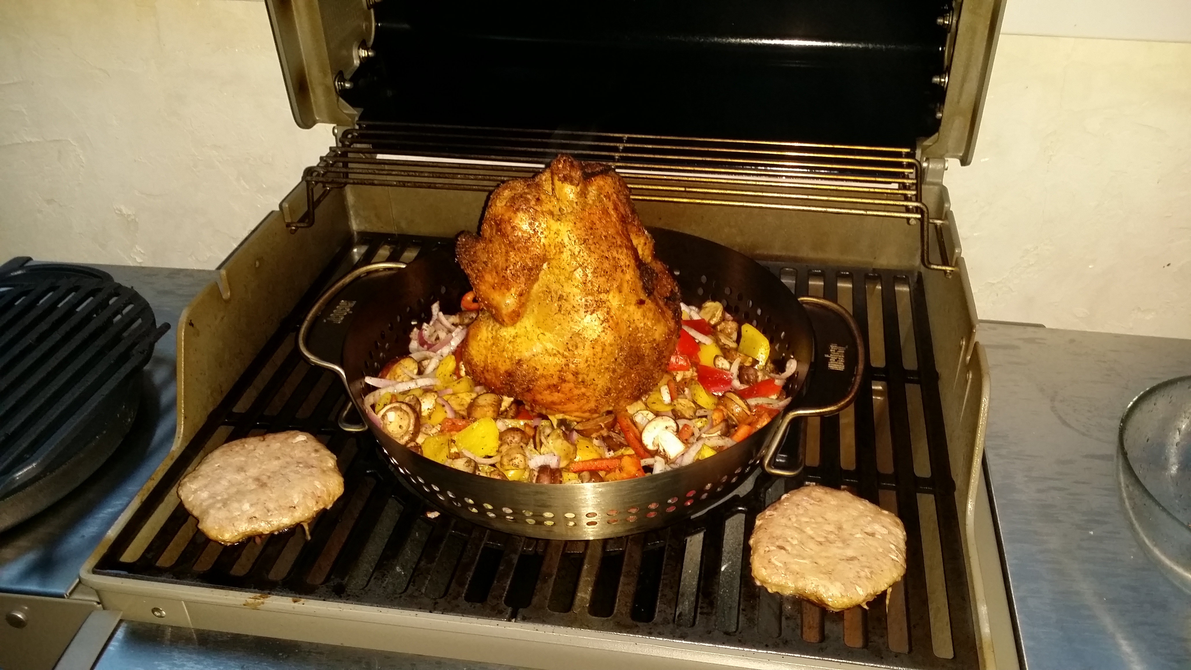 In de grillplaten van de Weber zit een ronde uitsparing, waar ik naast een ronde grillplaat ook andere toebehoren kan doen. Zo heb ik ook een ronde gietijzeren pan (voor het ‘bakplaten’, handig voor vis), een pizzasteen, en een ‘beer-can chicken’-rooster. Afgelopen zaterdag hadden wij nog steeds geen andere gelegenheid om te koken, dus ging ik met de barbecue aan de slag…