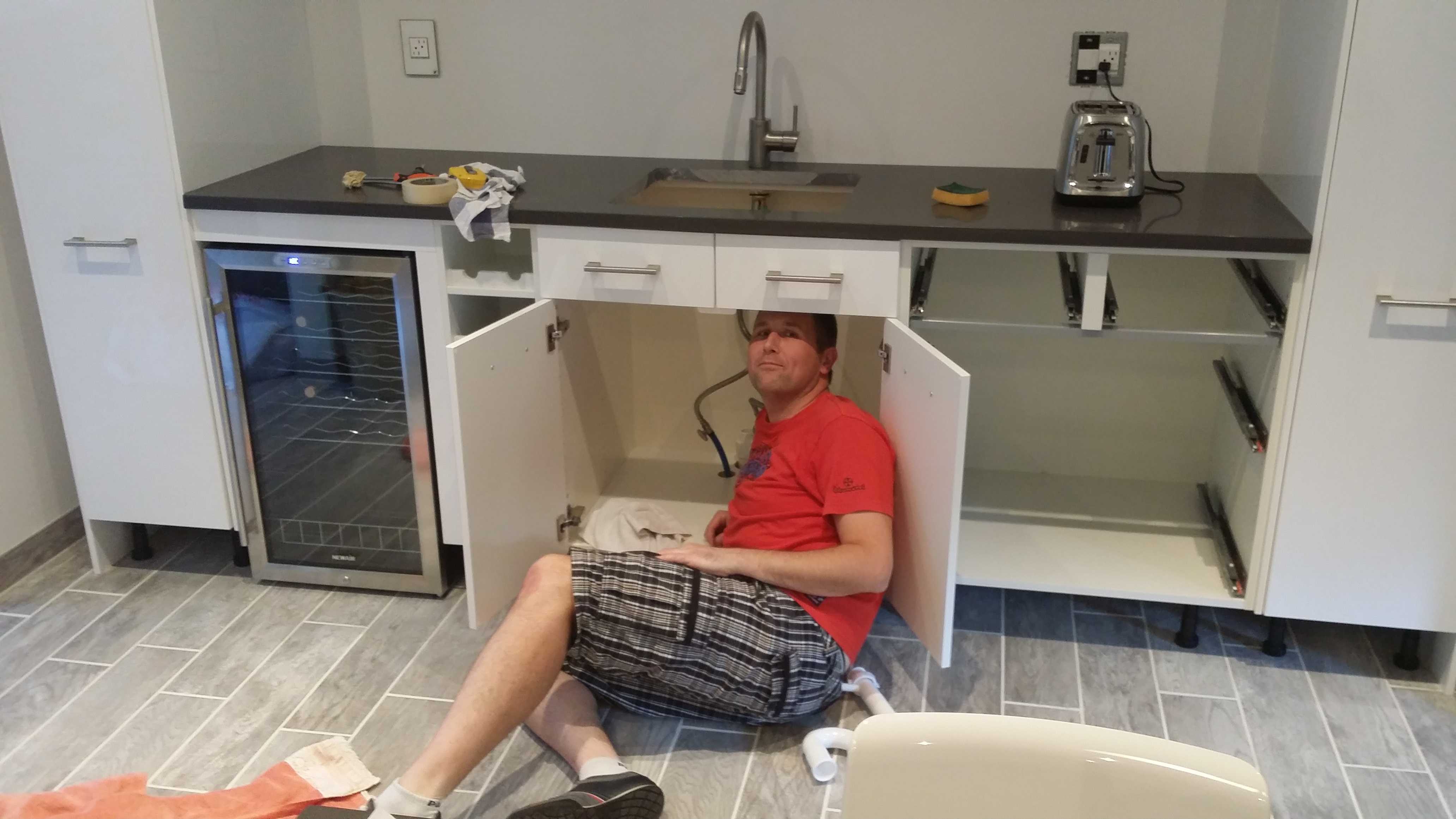 Daarna konden we eindelijk de wasbakken en de kranen met de bijbehorende afvoeren installeren. Dat was nog best lastig, dat was iets wat Michiel zelf heeft gedaan en dan wil je geen lekken of scheve kranen. Daarna nog de inductie-kookplaat installeren. En nog wat elektriciteitspunten… en wat schilderwerk bijwerken…. en de kastjes en lades weer uitlijnen en stellen…. Uiteindelijk zijn we tot in het weekend bezig geweest met de finishing touches (en nog moeten we hier en daar wat afmaken). De grote dingen die nog op de lijst staan: de achterwand en de plinten.