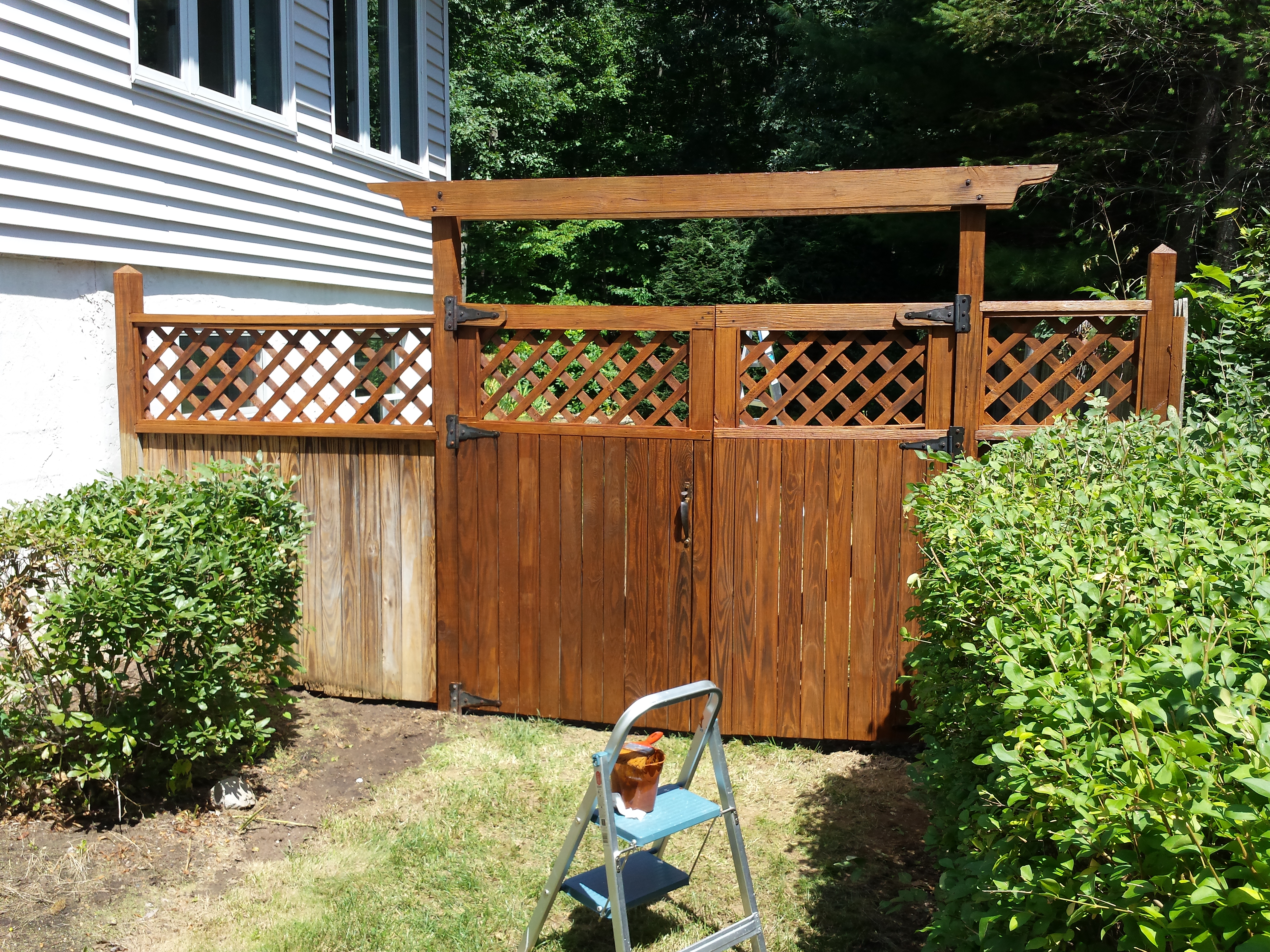 Michiel vindt het altijd leuk om buiten te spelen. Hij heeft hier een hogedrukreiniger gekocht, en daarmee niet alleen het deck (het terras) maar ook de hekken en schuttingen aan de voorkant schoongespoten. En vervolgens heeft hij ze ook in de beits gezet, zelfde kleur als het deck. Dat ziet er meteen zo ontzettend veel beter uit… Wat fijn, wat fijn.