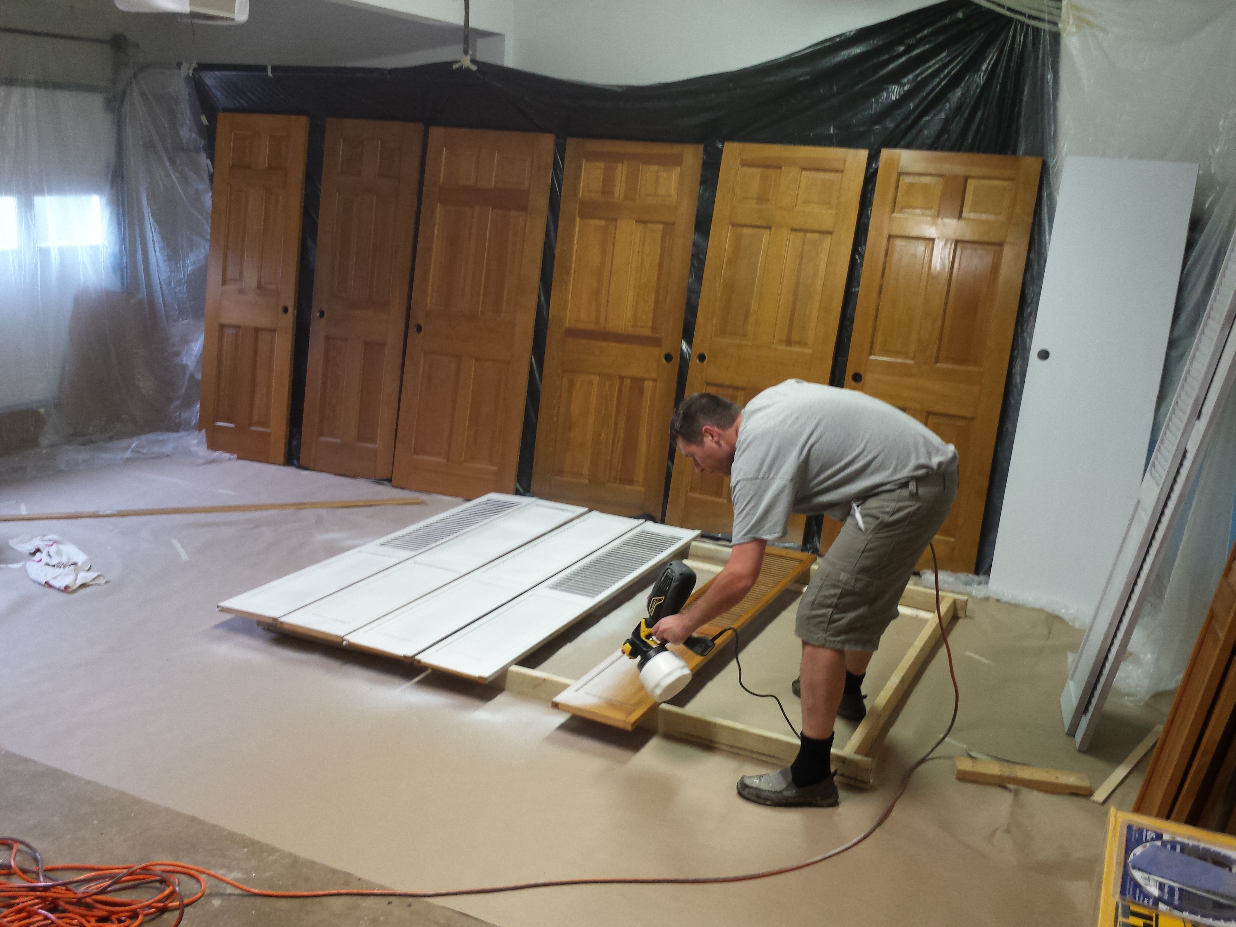 Kortom, we hebben de garage tijdelijk omgebouwd tot ‘verfstraat’. De muren zijn afgeplakt met plastic, karton op de vloer. Droogrek gemaakt voor de deuren…. De deuren van de bovenverdieping zijn allemaal uit de scharnieren gehaald, alle deurbeslag er af geschroefd… Deuren ontvet, en in de garage opgelijnd. En vervolgens met de grondverf in de spraypainter de deuren allemaal bij langs. En dat ging, natuurlijk met de nodige opstartproblemen, nog best mooi ook.