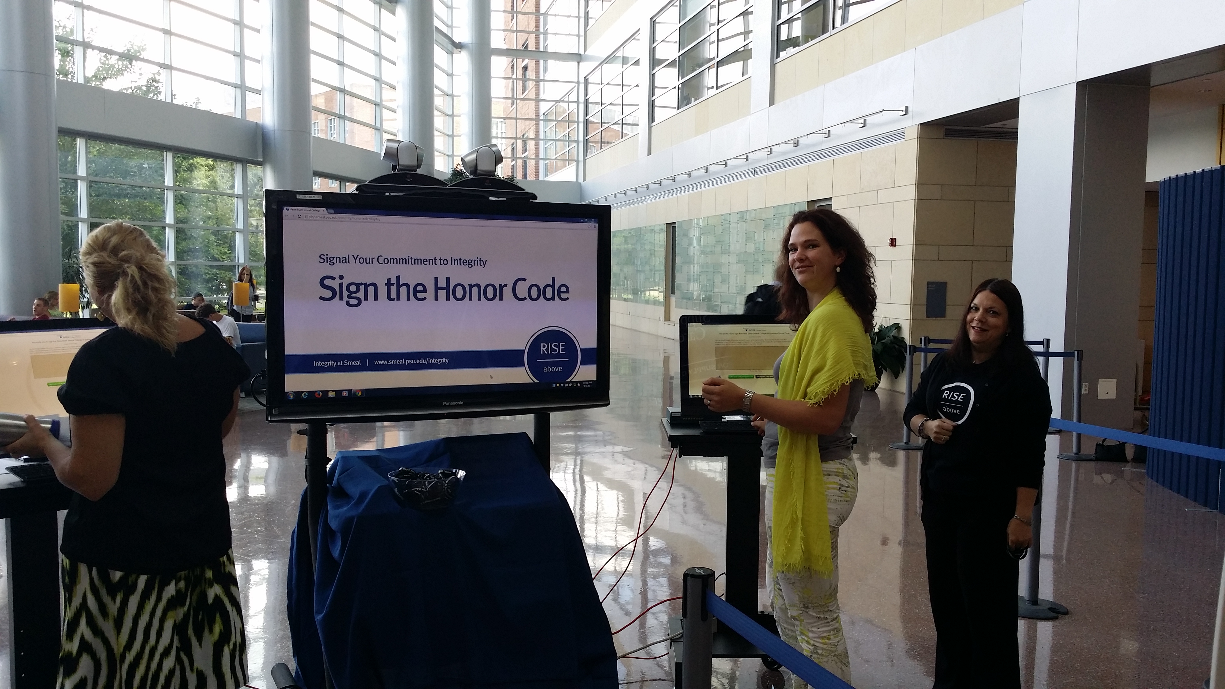 “The Code: We, the Smeal College of Business community, aspire to the highest ethical standards and will hold each other accountable to them. We will not engage in any action that is improper or that creates the appearance of impropriety in our academic lives, and we intend to hold to this standard in our future careers.”