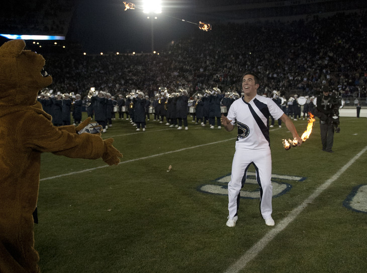 De Nittany Lion met de vorige feature twirler van de Penn State Blue Band (en het was nog een marketing student ook!)