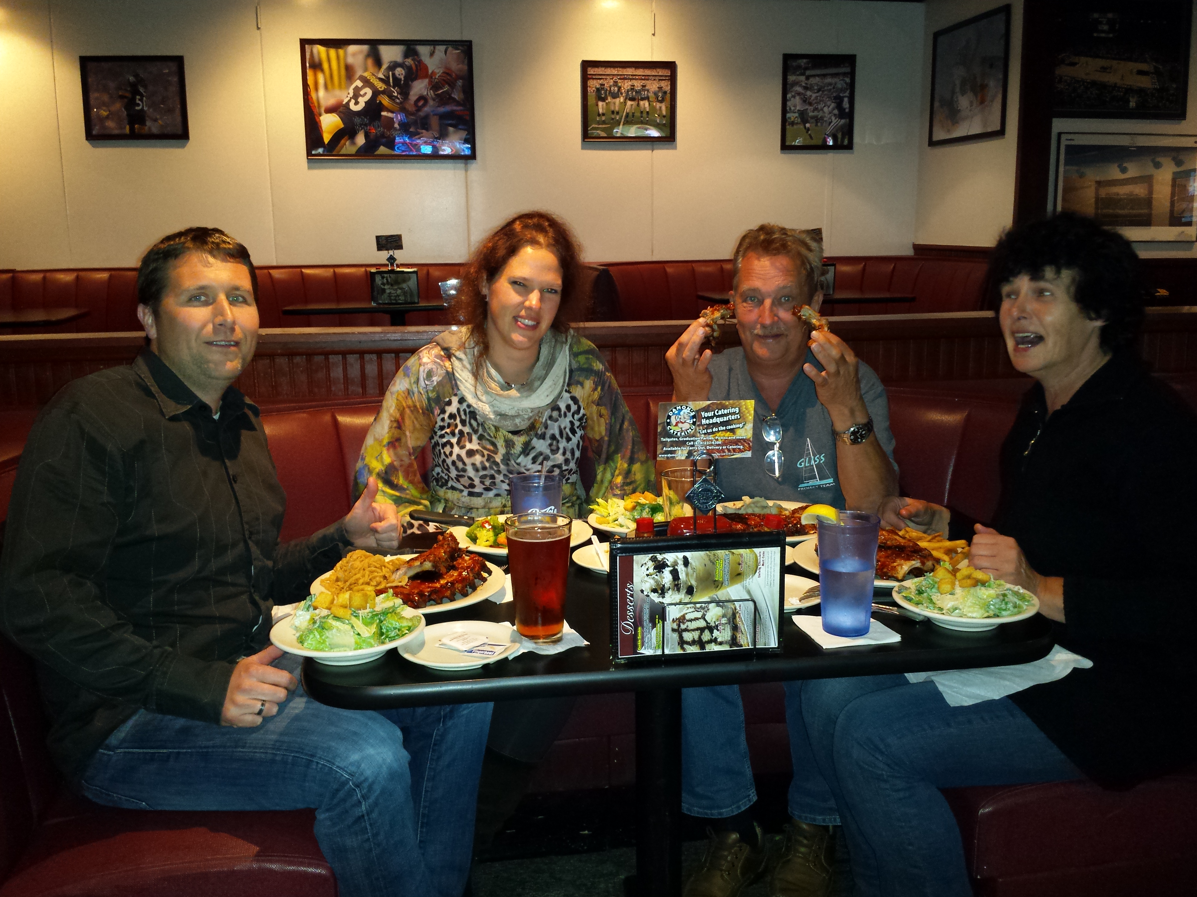 Na zo’n dag vol indrukken over onze nieuwe woonplaats is het tijd voor het diner. Waar ga je dan heen…? Michiel heeft besloten, vanavond. De afgelopen maanden zijn Michiel en ik regelmatig wezen eten bij een plaatselijke sports bar, “Damon’s”. Daar hebben ze hele lekkere “ribs”, en die hebben pa en ma en ook Michiel besteld (ik had zalm). Zo ontzettend mals, dat vlees valt meteen van het bot af. Superlekkere marinade. Het was een hoop werk, het waren misschien wel 20 ribs per persoon (ik heb er ook een paar meegeholpen…), maar oh oh wat lekker, en ja, ze gingen allemaal op!