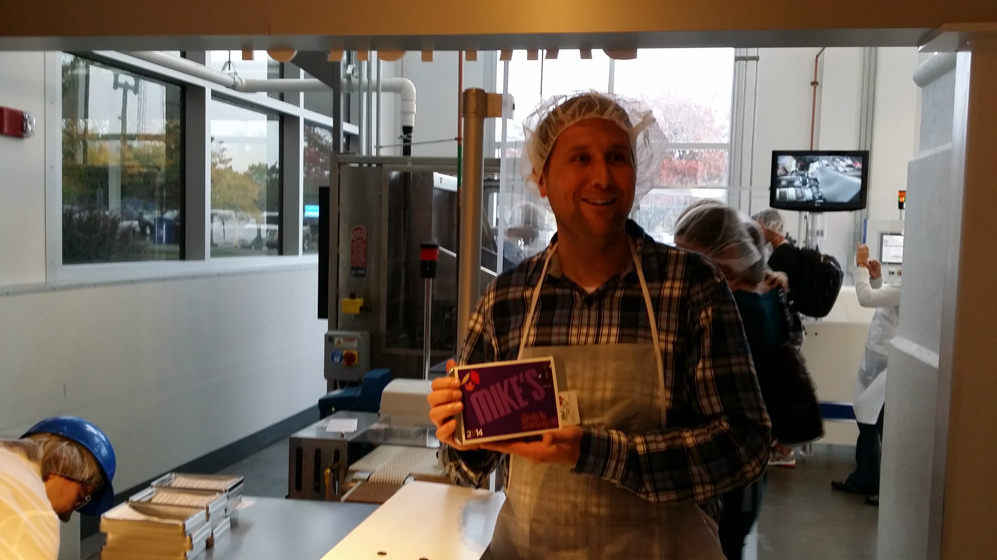 Bij Hershey kon je ook je eigen chocoladereep maken. Nou, dat leek ons dan wel interessant. Een beetje kokkerellen, chocolade maken, dat leek ons wel wat. Raar: aan het begin moesten we verplicht handen wassen, en we moesten een schort om en een haarnetje op. Het zou dus nogal wat geknutsel worden! Wat bleek… ik heb geen chocola aangeraakt! Je moest via een touchscreen je chocoladereep samenstellen, om die vervolgens via de band gemaakt te zien worden. En je kon een wikkel laten printen. Met allemaal zeer beperkte keuzes, eerlijk gezegd… Wat dan wel weer leuk was: de reep kwam met eigen wikkel in een mooi aluminium doosje terecht. En dat is een leuk aandenken.