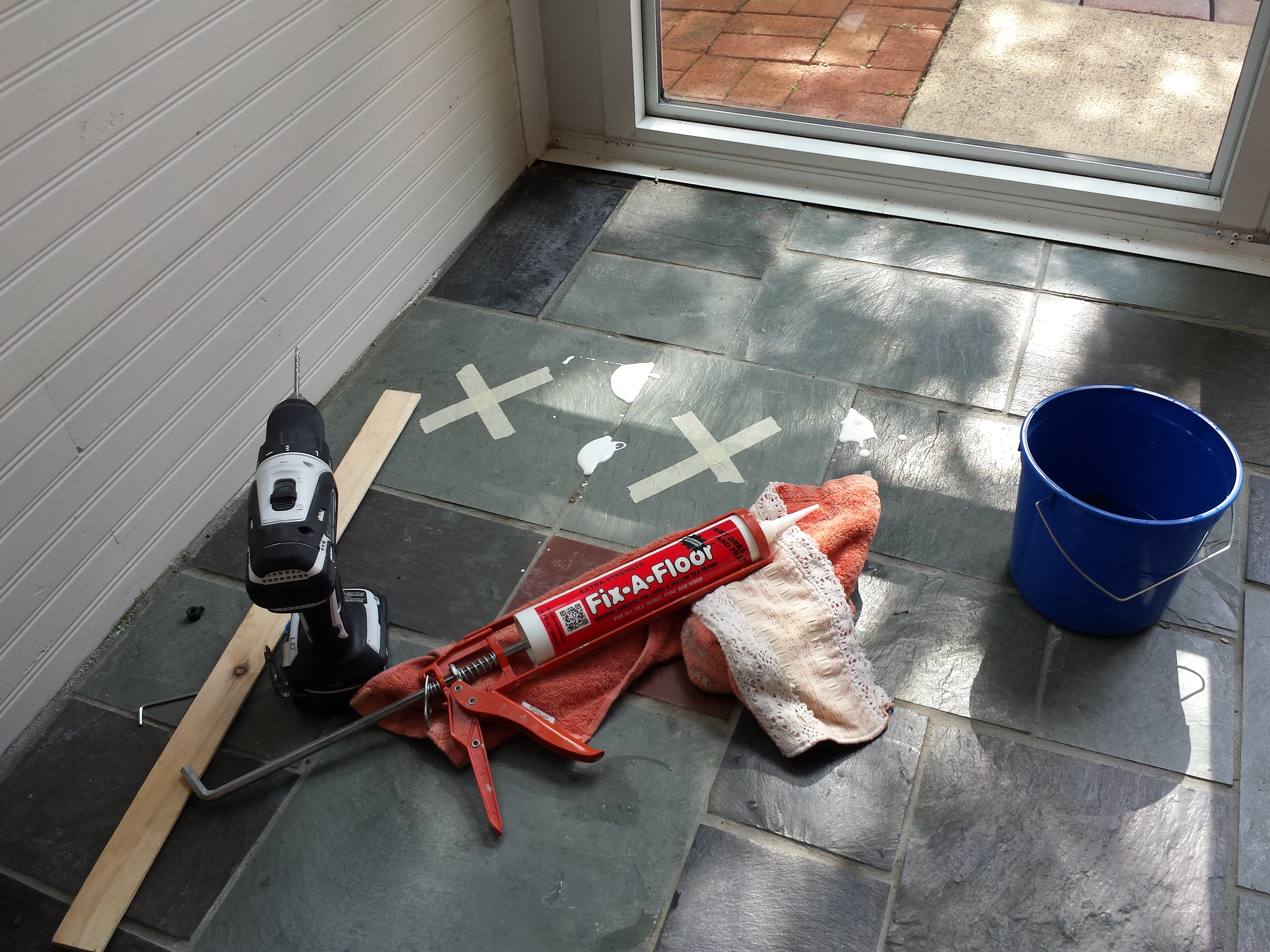 Een ander, niet zo’n opvallen klusje is het aanpakken van de tegels in de hal. Die tegelvloer is ongeveer het enige dat (naar mijn standaarden) okee is wat betreft stijl , dus die mag blijven. Maar… veel van die tegels klonken ‘hol’, omdat ze of slecht gelijmd zijn destijds, of de tegellijm eronder is opgelost. Hoe dan ook, het gevolg is een losliggende tegel, en dat wil je niet. Via internet had Michiel een spulletje besteld waarmee hij via een klein gaatje in de voegen of de tegel zelf weer lijm onder de tegel kan spuiten. Dat was even uitvogelen hoe dat precies moest, maar het is hem gelukt. De tegels zitten weer vast, en je ziet er haast niets van. Was wel een lasting karwei, maar ook een belangrijk karwei.