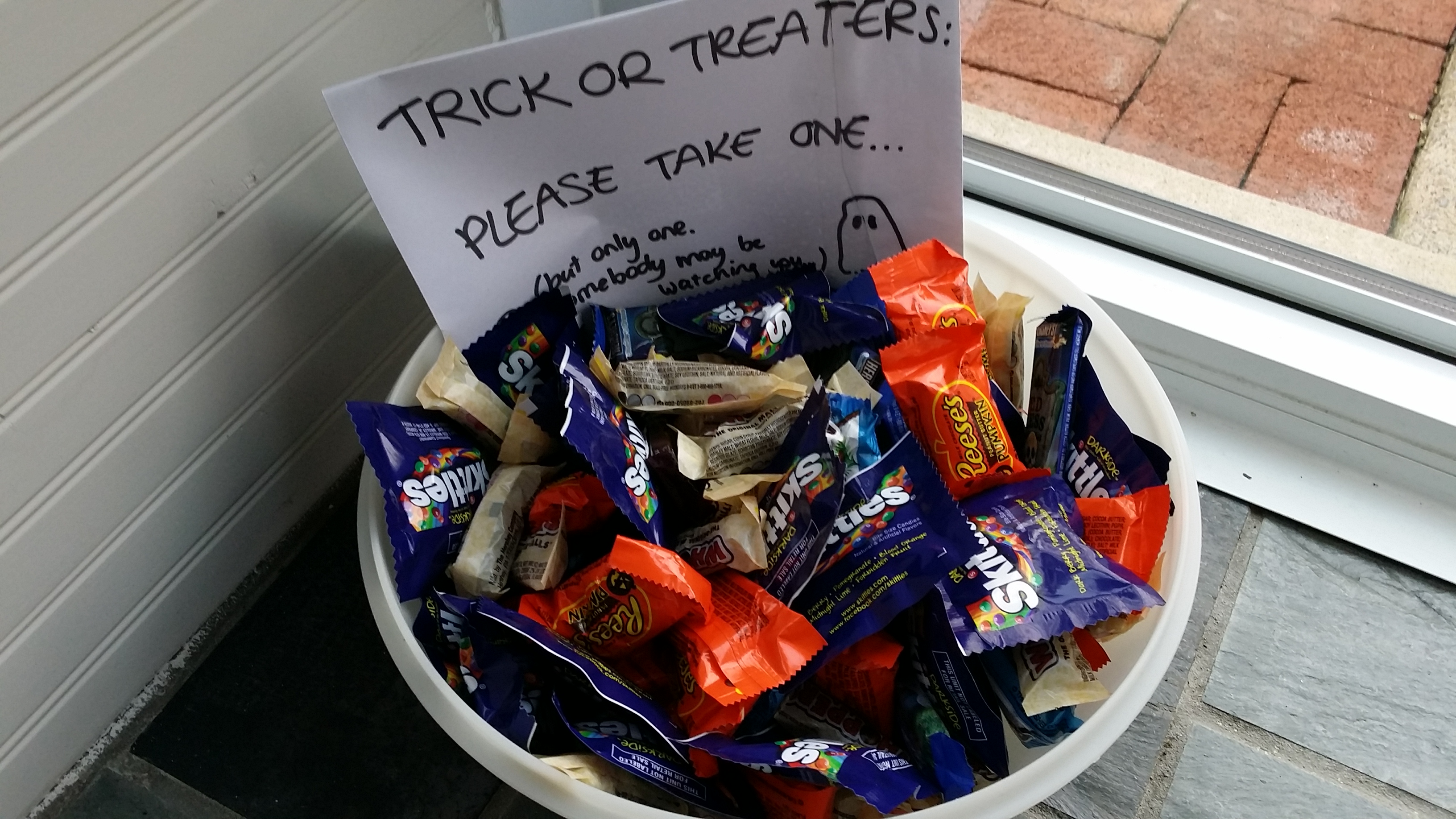 Nu waren wij afgelopen donderdagavond in de Skeller, bezig met trivia, dus wij waren niet thuis. Wel hebben we een grote kom snoep bij de voordeur gezet, met een briefje erbij. We hadden goed ingekocht – je weet maar nooit, en ik heb liever te veel dan te weinig (anders sta je meteen als de slechte buren te boek bij de buurkinderen). Bij thuiskomst bleken we inderdaad te veel te hebben gekocht. Nog geen tien kinderen waren langsgeweest, schat ik. We wonen in een steil naar onder lopende, doodlopende weg, dat zal er wel mee te maken hebben.