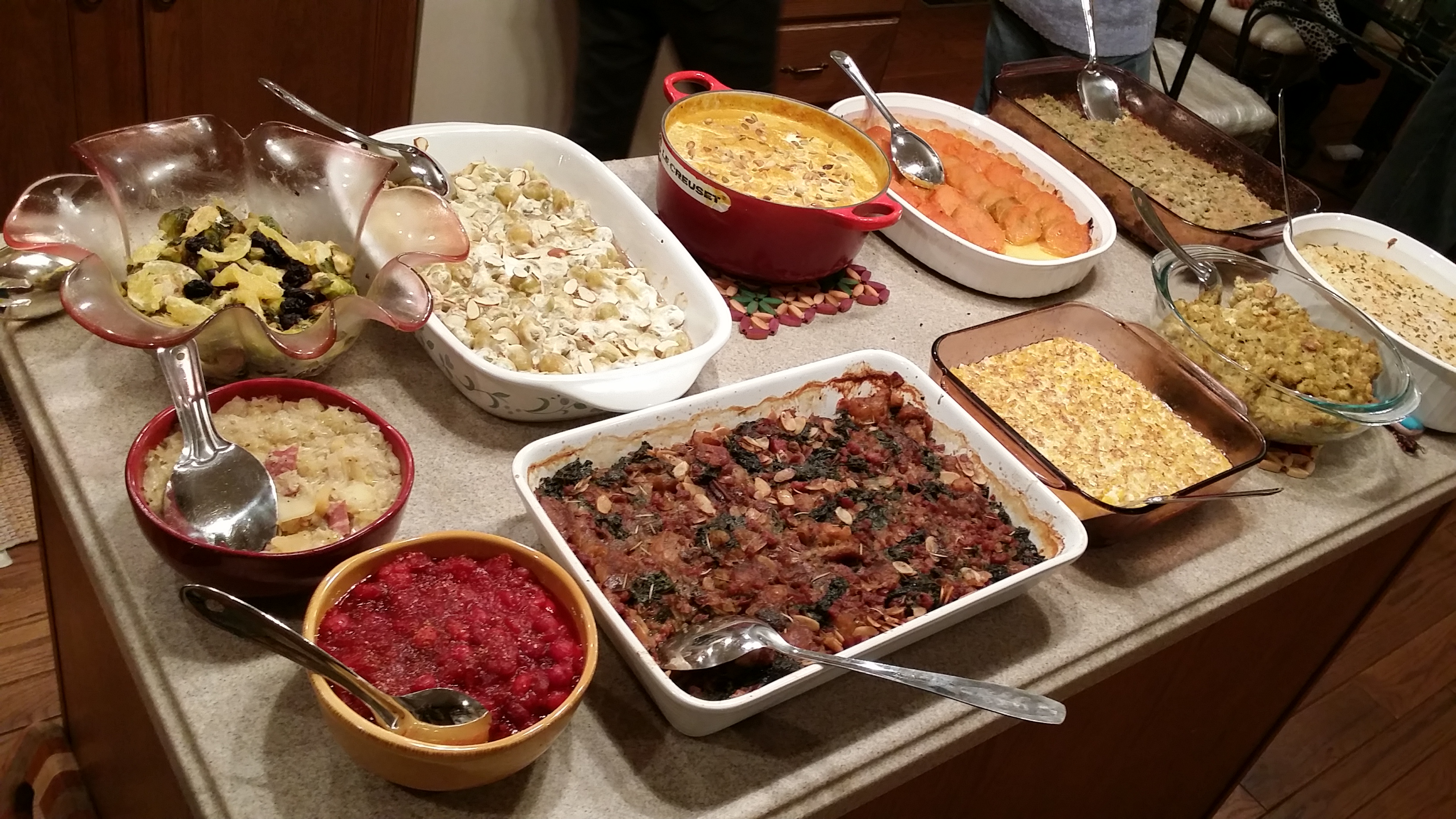 Wij dachten eerst dat het diner een Indiaas tintje zou hebben. Nou… mooi niet. 16 gerechten, allemaal afkomstig uit een andere staat uit Amerika, allemaal ‘from scratch’… en allemaal overheerlijk. Abbas had het volgende gemaakt (misschien vergeet ik een gerecht, beginnend bij de rode pan soep en dan met de klok mee): pittige pompoen-appelsoep, yams, ovenschotel van sperzieboontjes met spekjes, aardappelpuree met gruyere, stuffing van corn bread, romige mais, een schotel van kalkoengehakt-boerenkool-amandel, cranberry sauce, zuurkool, spruitjes met sinaasappel, druivensalade, en dan nog de kalkoen en twee soorten gravy. Als desert hadden we een crispy apple-crumble en een pompoencheesecake. Overheerlijk. En ook nog gezellig.