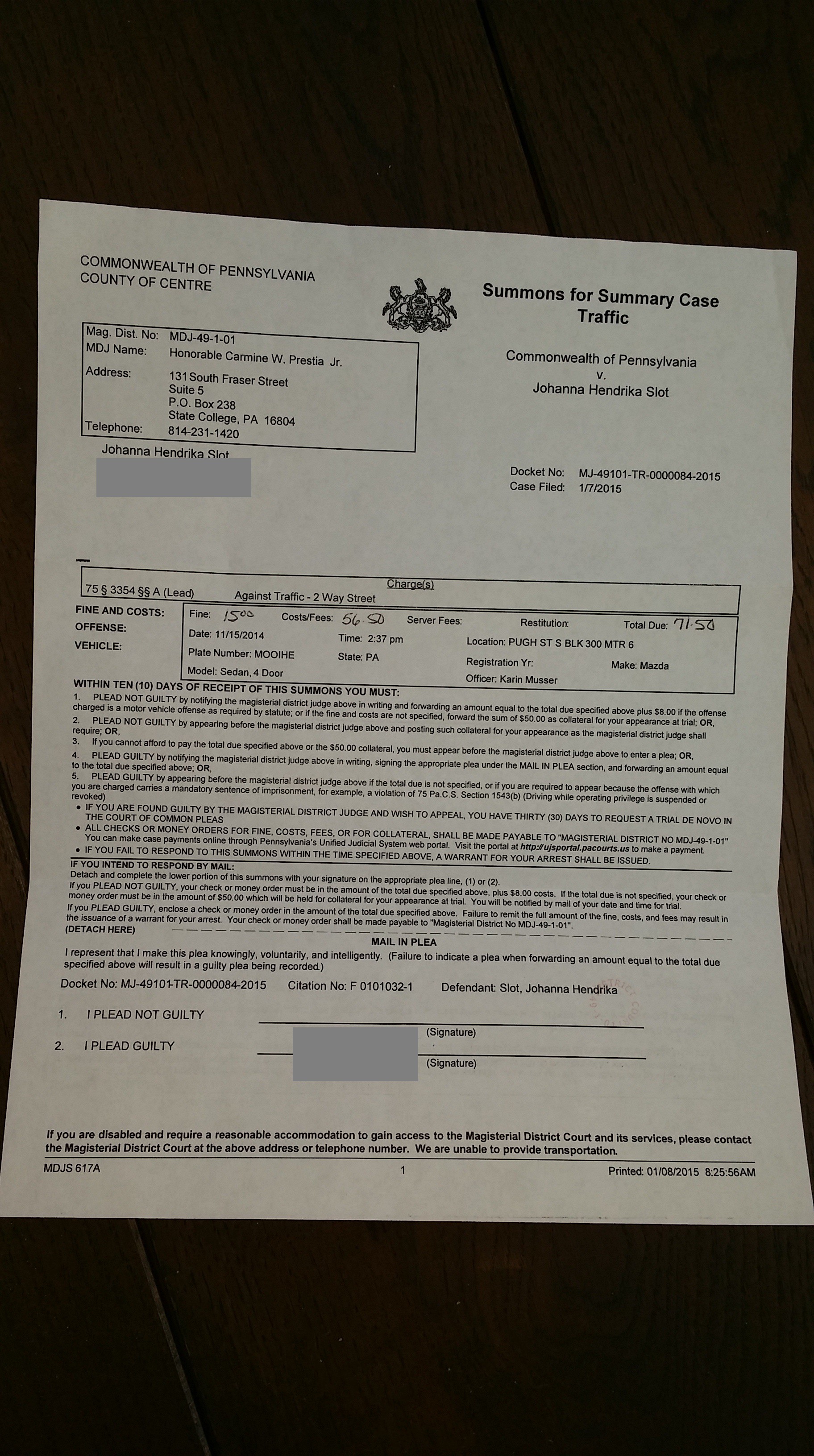 Denk niet dat ze hier in Amerika een betalingsherinnering of zo sturen, al dan niet met administratiekosten of zo er bovenop. Nee, al ware ik een echte crimineel, de parkeerboete ging meteen door naar de rechter, en daar kreeg ik een dagvaarding van: “Summons for Summary Case Traffic: Commonwealth of Pennsylvania versus Johanna Hendrika Slot”. Of ik even wilde verklaring of ik ‘schuldig’ of ‘onschuldig’ was, en of ik even voor de rechter wilde komen. Ik kon ook community service doen in plaats van de boete, als ik dat zou willen. Maar ik kon ook gewoon de boete betalen, wel met extra kosten natuurlijk (totaal was nu al 71.50 dollar). En natuurlijk staat nu voor de eeuwigheid geregistreerd dat Johanna Hendrika Slot met licence plate ‘MOOI HE’ een parkeerboete heeft opgelopen van 15 dollar.