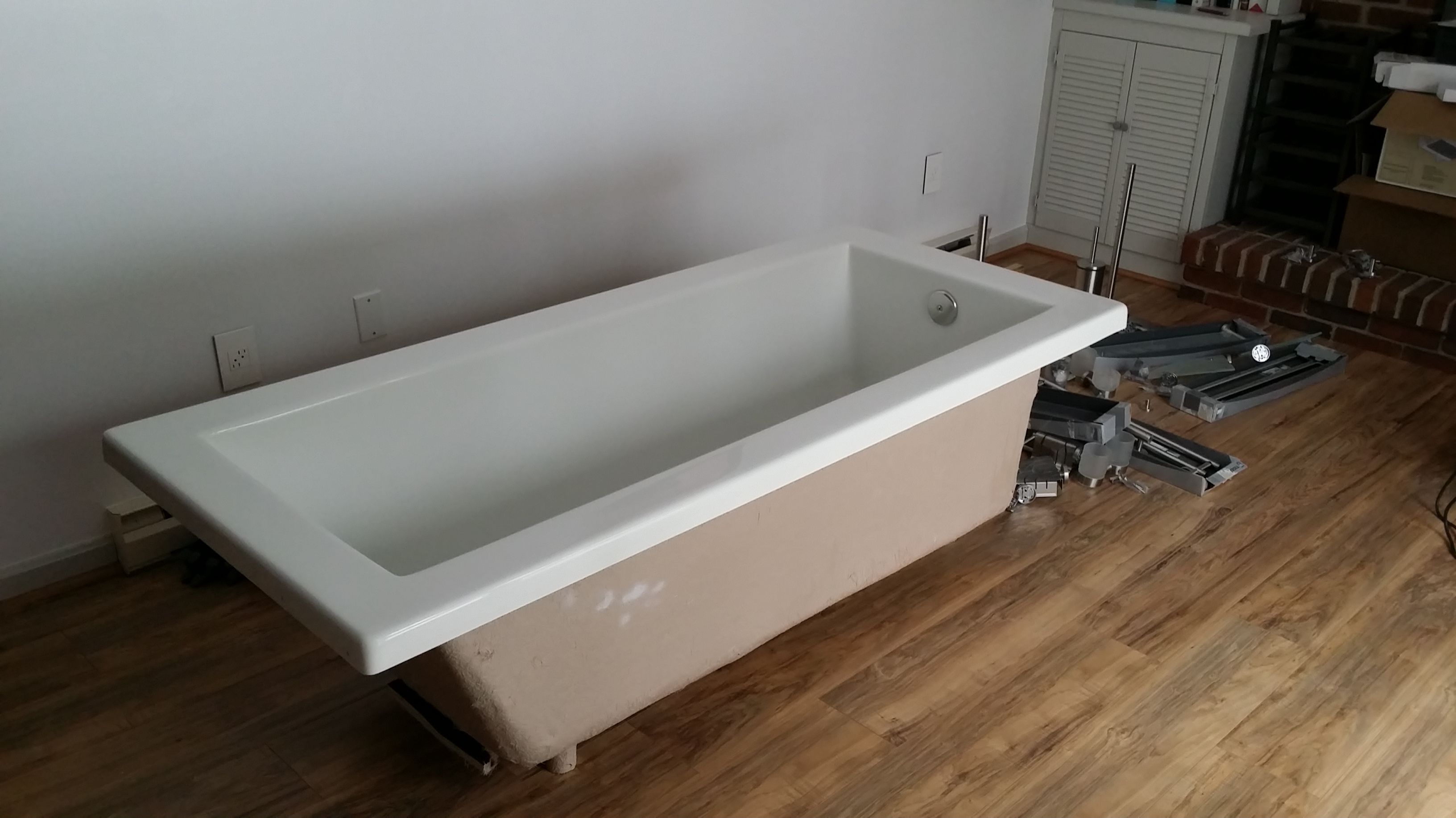 Dat waren er nogal wat. We hadden juist dit bad bij deze webshop gekocht en niet bij de Home Depot besteld (en wel voor een dikke 200 dollar meer…) omdat we er bij die workshop ‘tile flanges’ bij konden krijgen. ‘Tile flanges’ zijn een soort opstaande randjes die je kunt gebruiken om het waterbestendige backerboard op het bad te laten uitkomen, en om dan vervolgens te gaan tegelen. Dat moet, omdat het water anders buiten het bad om richting houten vloer en houten muren lekt – en dat wil je niet in Amerikaanse huizen. Die ‘tile flange’ optie had Home Depot niet. Wij verwachtten dus op z’n minst geintegreerde randjes, die samen met het bad uit een stuk waren gehaald. Maar nee. Ze hadden gewoon een paar stroken acrylplastic op de badranden geschroefd. Daar hadden we dus niets aan, want het water kan daar nog net zo goed langs. Maar goed, er zijn andere oplossingen voor.
