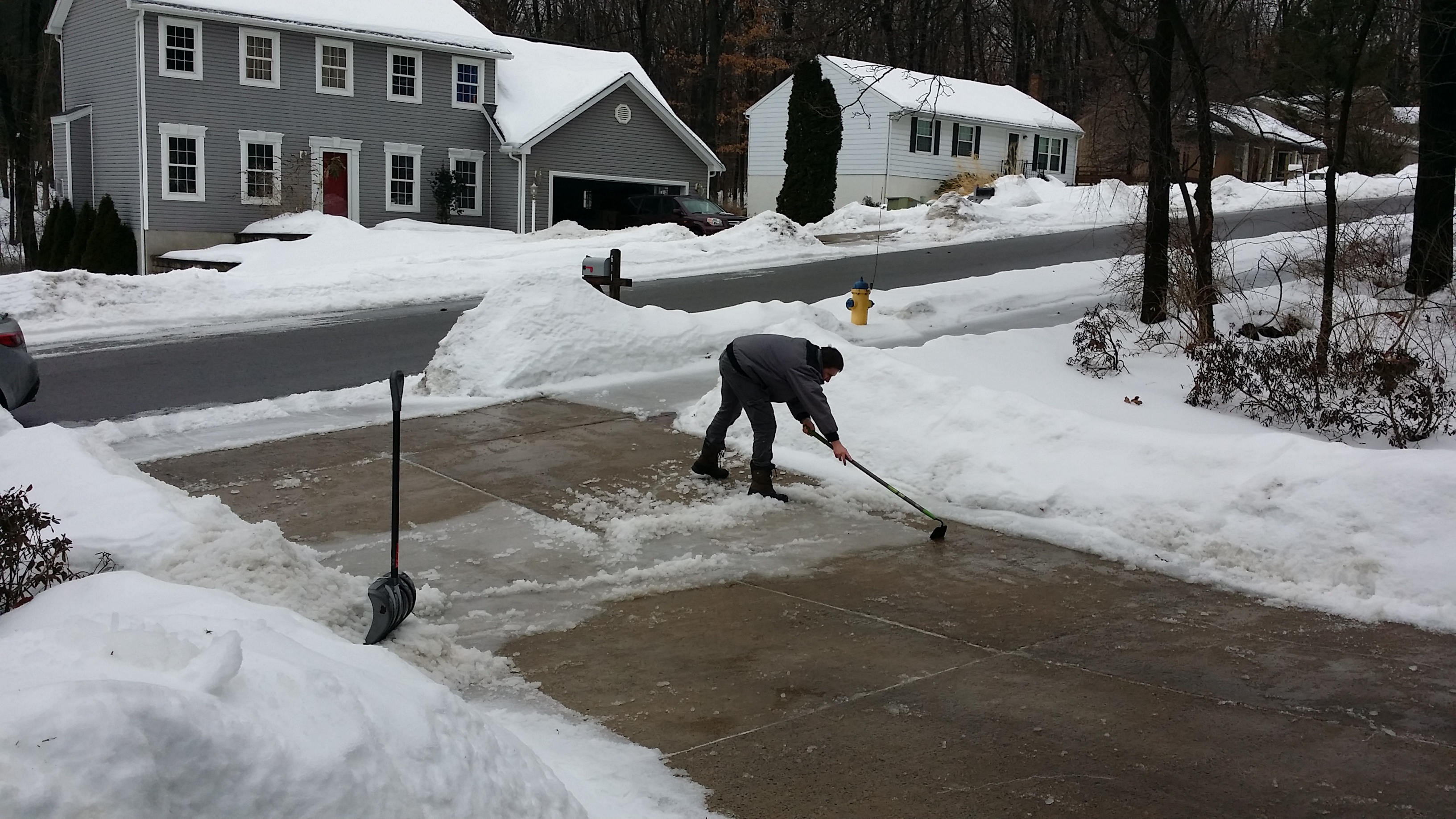 Michiel schoffelt het ijs van de oprit af. Het wordt lente!