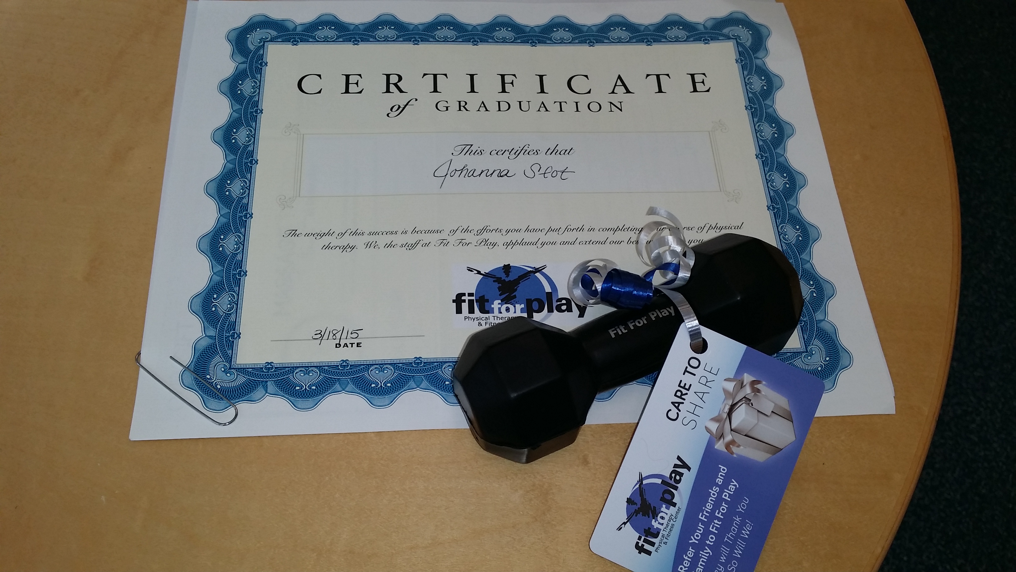 Een stuitend voorbeeld is mijn Fysiotherapiediploma. Mijn WAT? Sinds wanneer heb ik een studie fysiotherapie gedaan, dat was toch Hendrieke? Nee… toen ik vorige week ‘ontslagen’ werd van mijn fysiotherapie in verband met mijn voet+rug kreeg ik een heus “Certificate of Graduation” mee vanwege het volbrengen van mijn fysiotherapietraject. Vertaalde tekst: “Het gewicht van dit succes is af te meten aan jouw inzet in je fysiotherapiecursus. Wij, de medewerkers van Fit for Play, juichen dit toe en feliciteren je van harte met het behaalde succes.” (lieve hemel…) En als ‘prijs’ kreeg ik er een stressbal in de vorm van een gewicht bij.