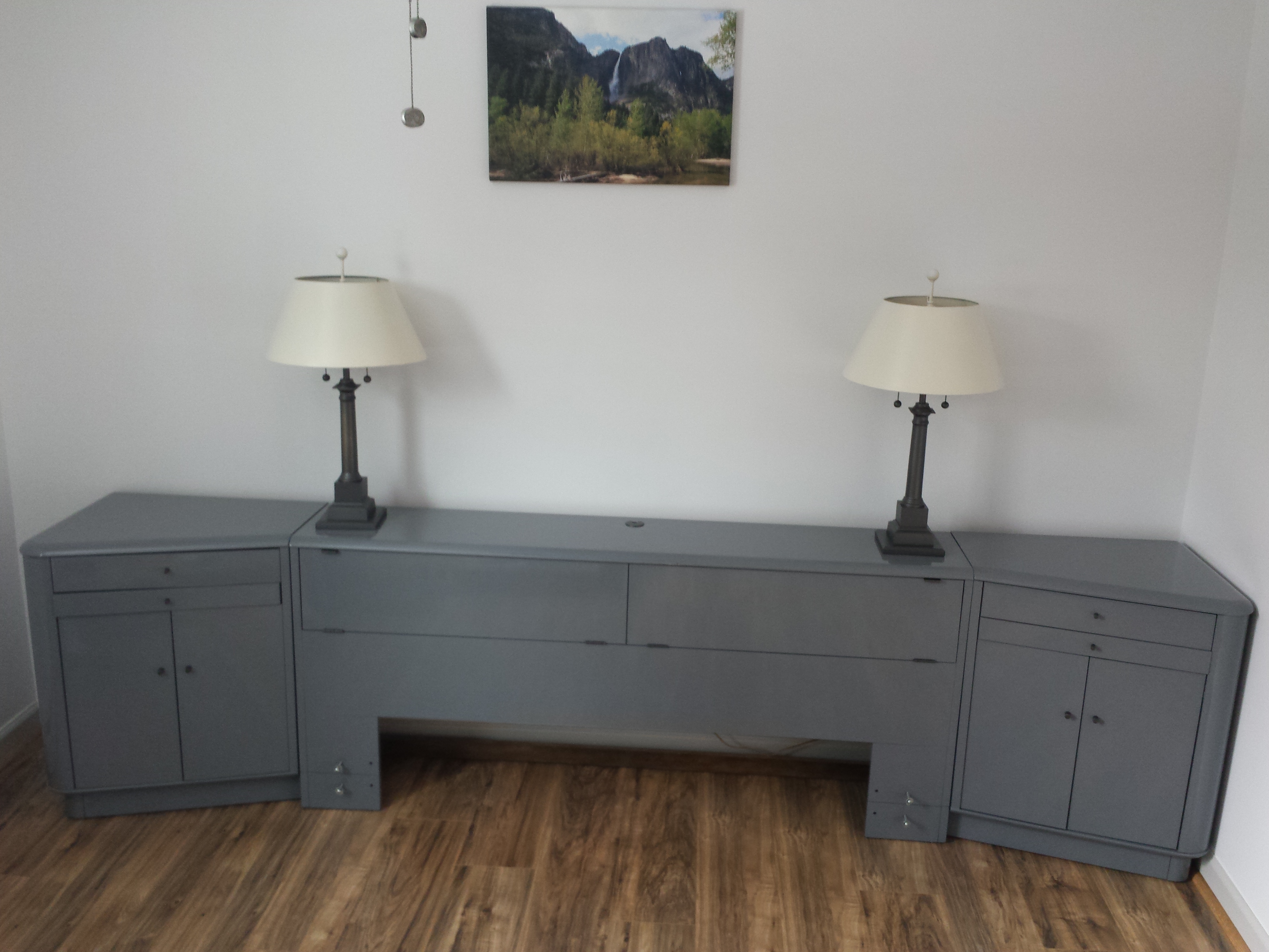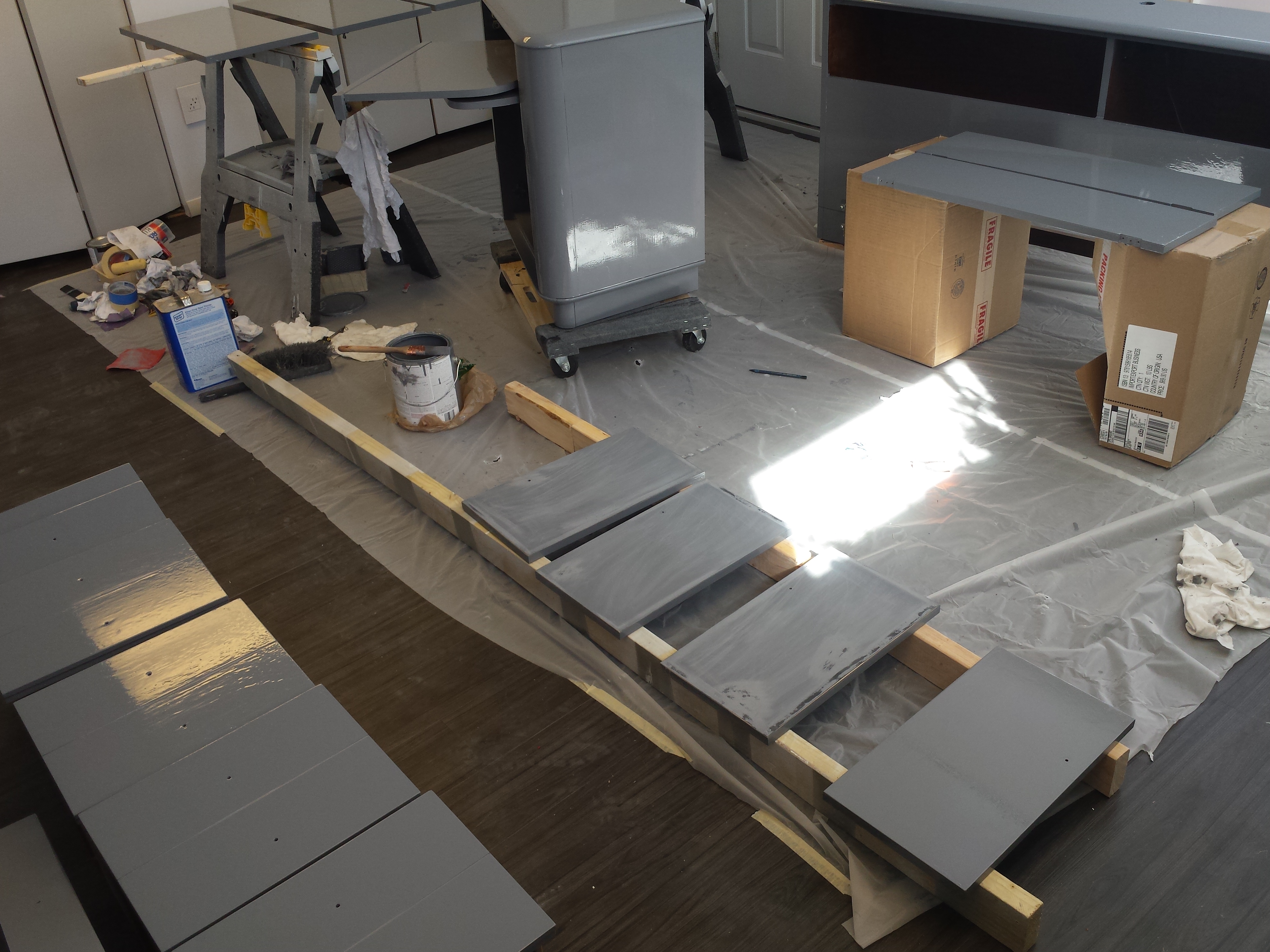 Omdat Michiel zo lang op het bad moest wachten en later ook nog eens op de tegels moest wachten, kon Michiel ondertussen werken aan een tussenproject: kastjes schilderen. In de zomer heb ik een stel meubels overgenomen van een collega van mij: bureaus, boekenkasten, en een bed. Die meubels hebben Michiel en ik geschilderd (nou ja, ik… ik heb twee nachtkastjes geschilderd die Michiel later weer heeft overgeschilderd), met als gevolg dat ze nu allemaal uniform grijs zijn. En dat past goed bij de rest van het huis.