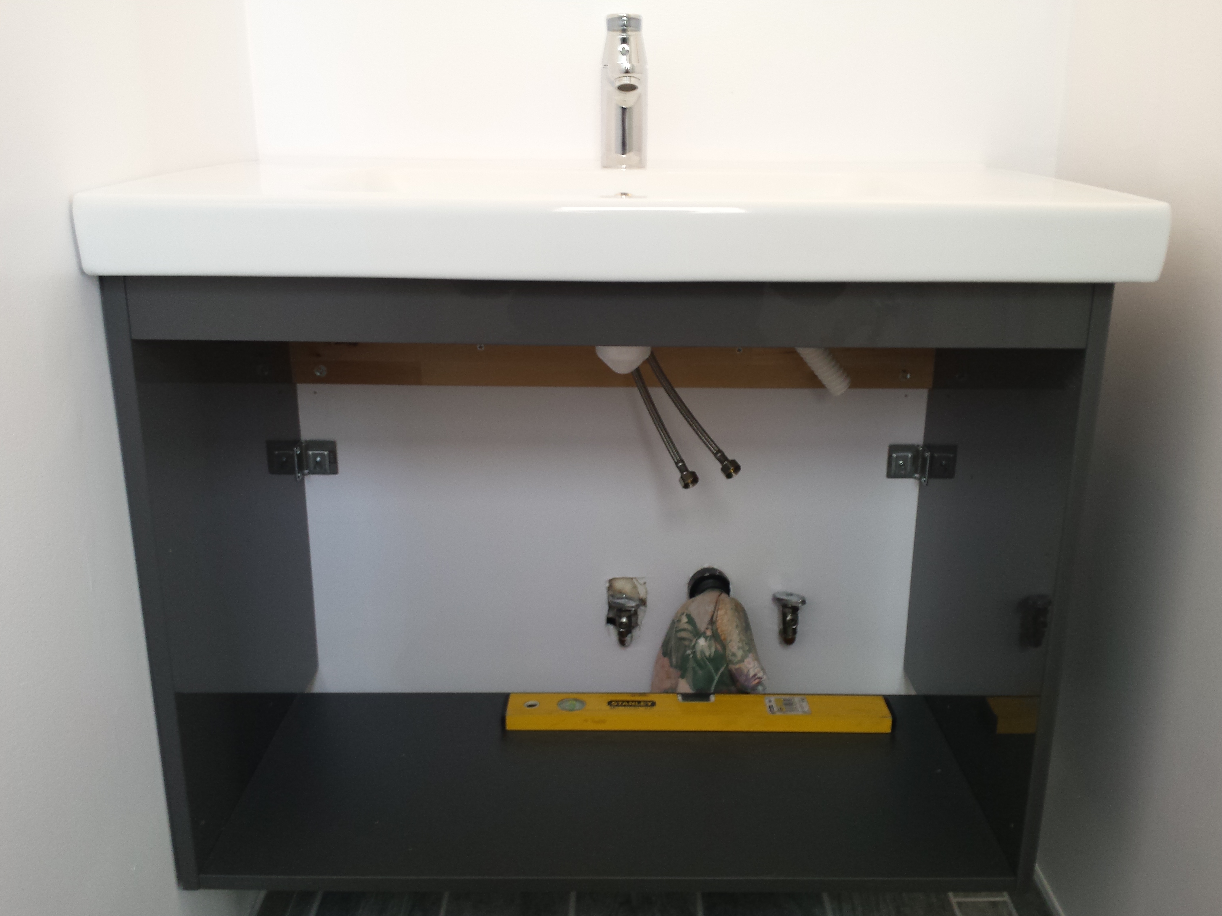 En eindelijk heeft de wc beneden een badmeubel, met wasbak en kraan, en een spiegel (de lamp komt nog). Dat meubel in elkaar schroeven ging heel makkelijk, maar de montage op de muur was weer een uitdaging: IKEA had een oude (en verkeerde) afvoerset bijgevoegd, die simpelweg niet pastte.