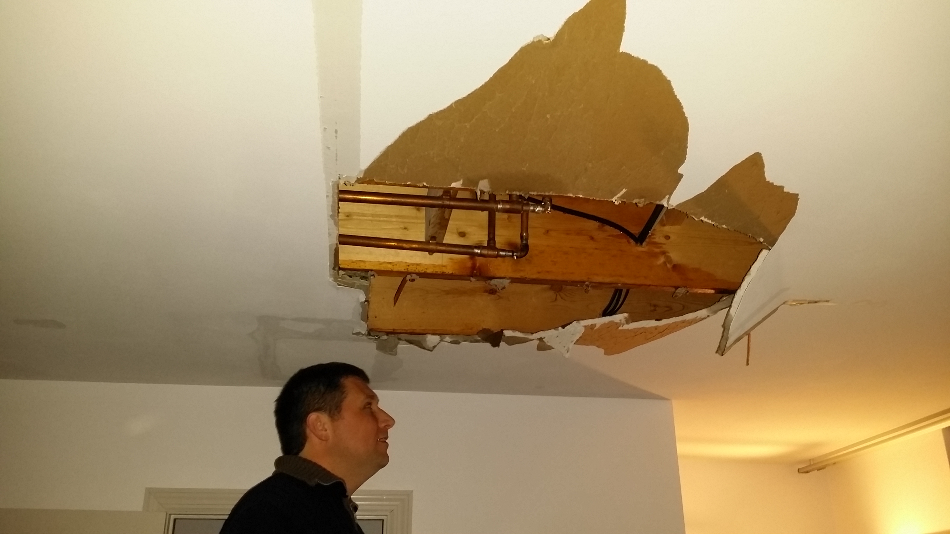Michiel had boven de leidingen inmiddels weer gefixed. Hij kwam naar beneden om het plafond te inspecteren. Helaas was deel niet meer te redden, en moest die steenwol er gewoon uit. Hand in het plafond, en als papier mache kwam het naar beneden…