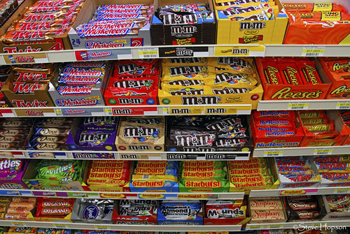 Wat valt op? Afgezien van wat kauwgum, mints en een verdwaalde Twizzer is alles chocolade. En verreweg het meeste snoep komt of bij Hershey, of bij Mars vandaan. En dan heb je nog Cadbury, Nestle en Ferrero – maar dat zijn relatief gezien kleintjes. Mars en Hershey domineren de markt, en als je merk daar niet bij zit kun je schapruimte vergeten, lijkt het wel.