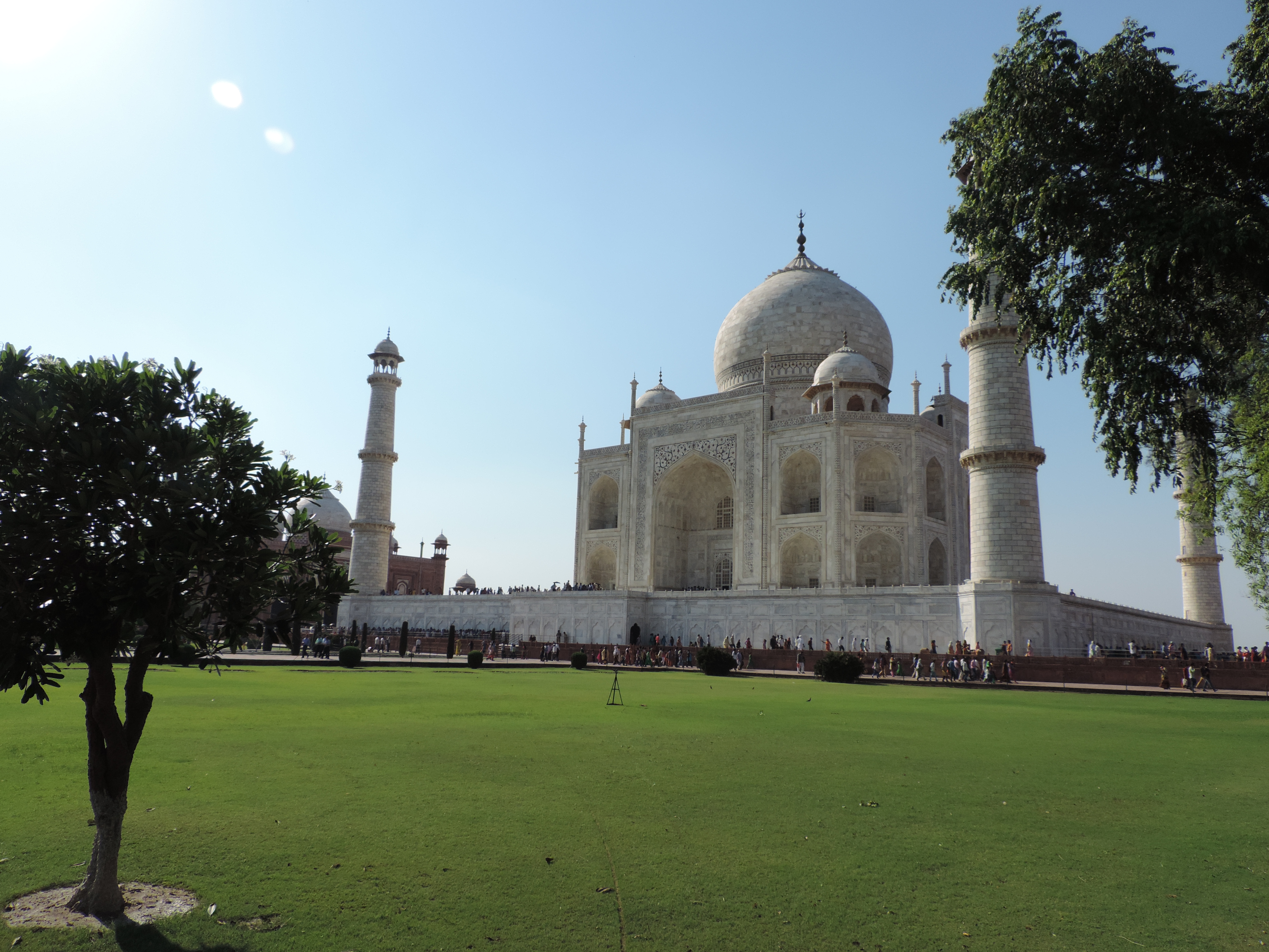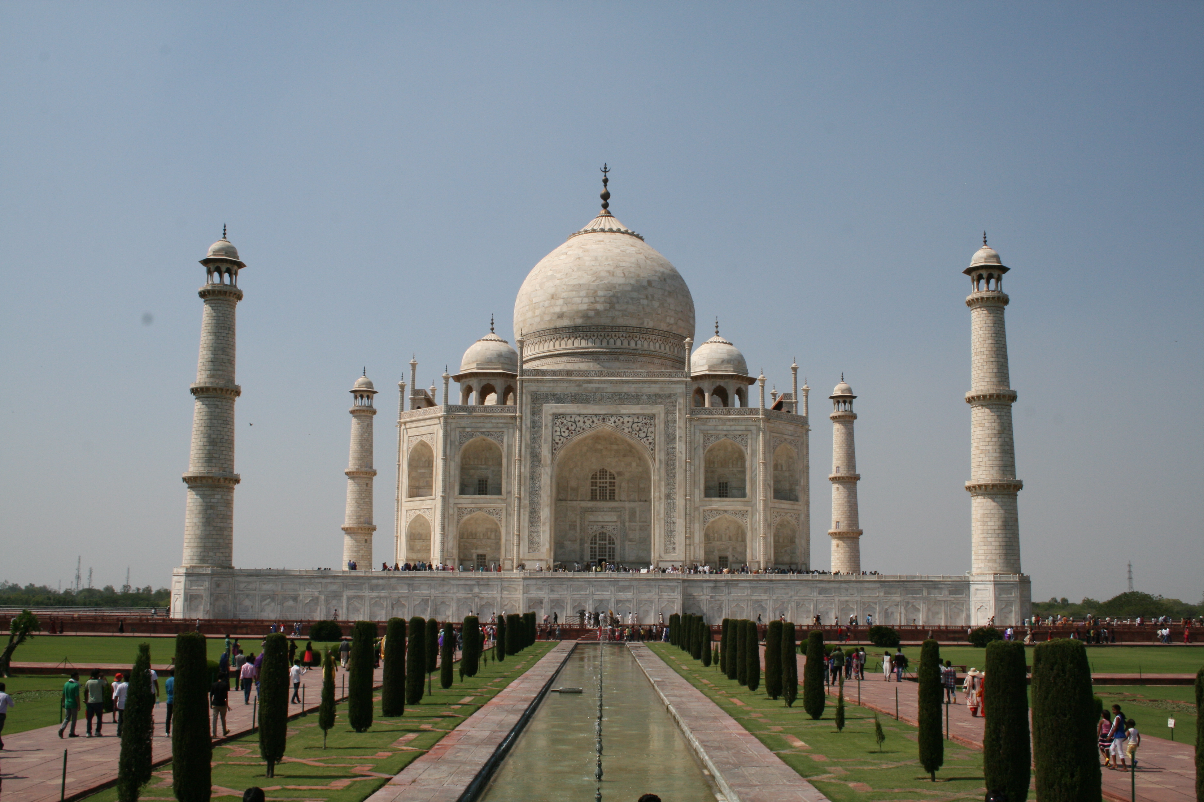 Aan de buitenkant is de Taj Mahal echt ontzettend indrukwekkend. Ik denk dat het echt het mooiste gebouw is dat ik ooit heb gezien. De Duomo in Firenze (Florence, Italie) komt dichtbij, maar die staat midden in de stad omringd met andere gebouwen waardoor de architectuur niet optimal uitkomt, vind ik. Daarentegen staat de Taj Mahal helemaal vrij in een prachtig symmetrische groene tuin. Het contrast van het groene gras, de blauwe lucht en het spierwitte gebouw is fantastisch.
