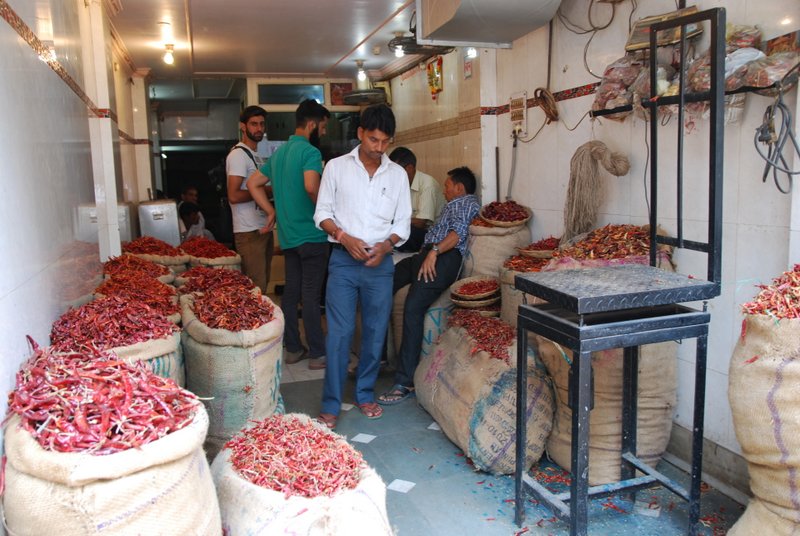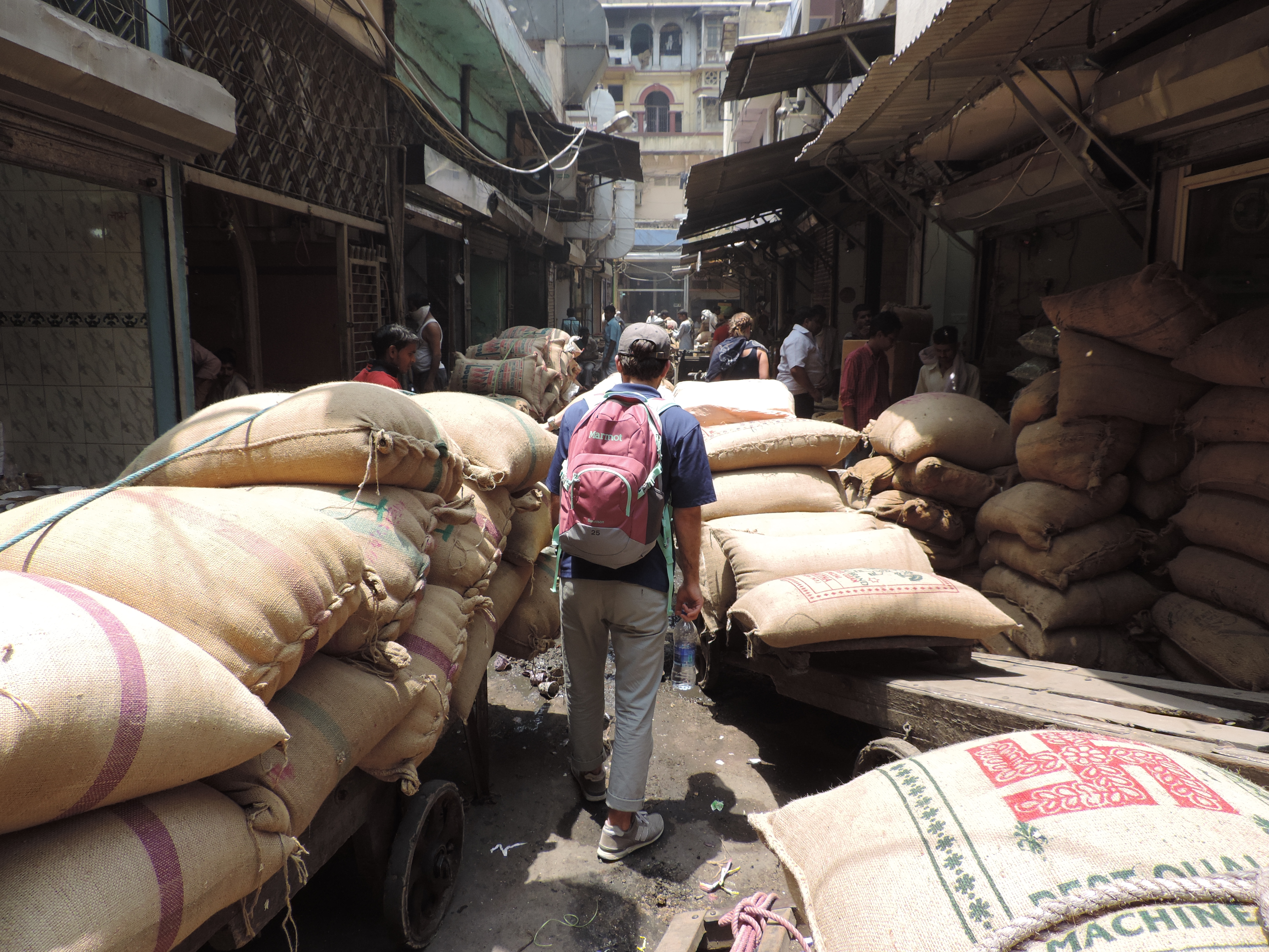 Dat was nog niet eenvoudig. We werden afgezet dichtbij de Jama Mashid moskee, voor het Red Fort (waar we de volgende dag nog terug zouden komen), recht tegenover de Chandni Chowk wijk. Chandni Chowk is een wirwar van een aantal straatjes, een paar kilometer lang, waar allerlei winkeltjes van ‘hetzelfde’ bij elkaar zitten. Zo kwamen we eerst het textiel-deel tegen, waar honderden kleine winkeltjes (type pijpenla) naast elkaar zaten. Na zo’n 40 minuten zoeken (en dat in 44, 45 graden in een zeer drukke omgeving) en nadat we drie keer hadden gevraagd hadden we eindelijk de specerijenmarkt gevonden. Hoe we dat wisten? Iedereen begon te niezen!
