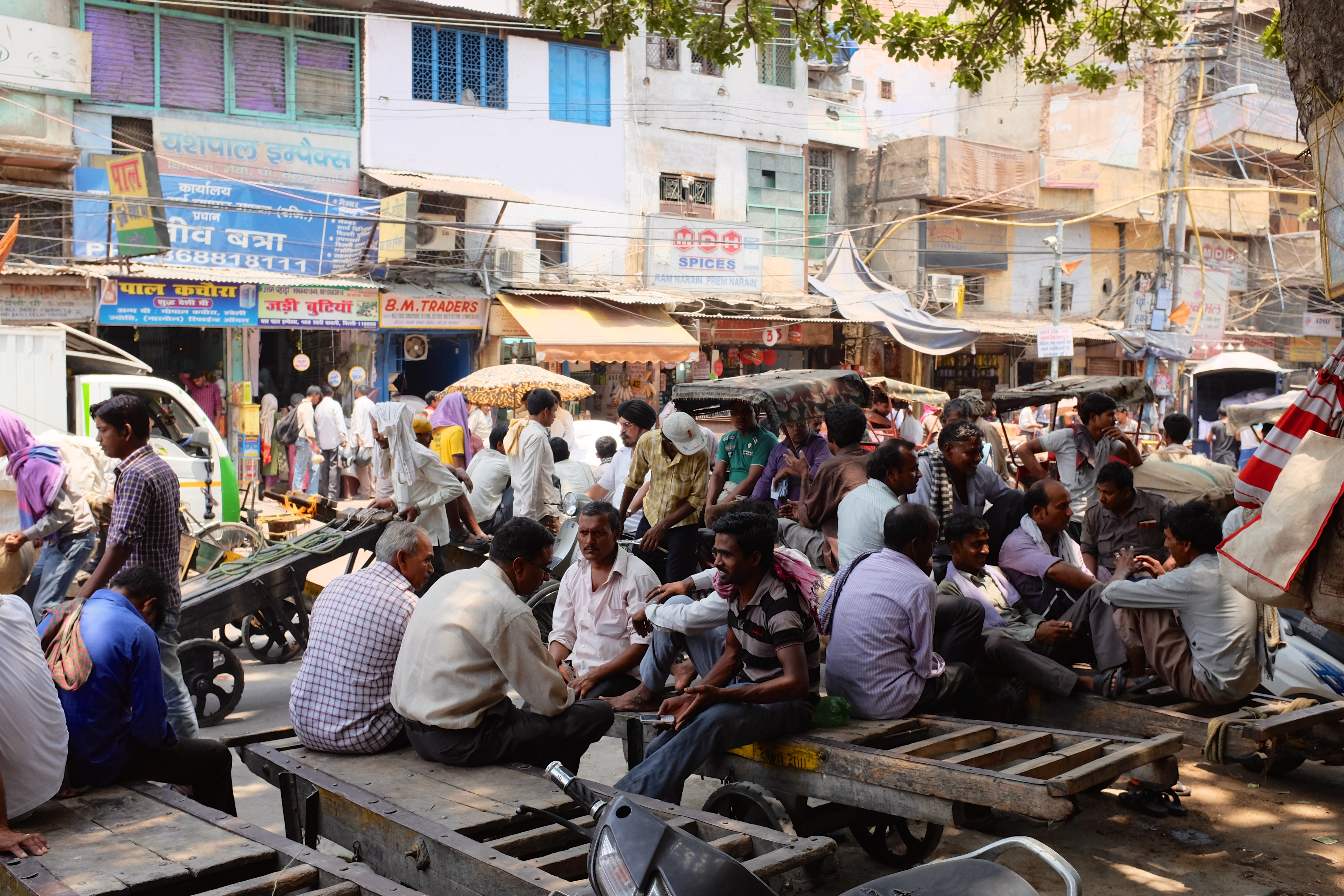 Maar eerst gingen we die dag nog op pad in Delhi. Inmiddels waren we met een grotere groep, en redden we met twee taxi’s. Christy bleef in het hotel werken (zij werkt als advocaat en had nog wat taken af te maken) en Michiel lag helaas nog in bed, die voelde zich nog helemaal niet goed (kon geen eten binnenhouden, was slap, moe). En zo gingen we met z’n achten naar Oud Delhi, naar Chandni Chowk. Die bestemming, de ‘oude markt’, was op het programma gekomen vanwege mijn voorkeur – ik wilde heel, heel graag naar de specerijenmarkt.