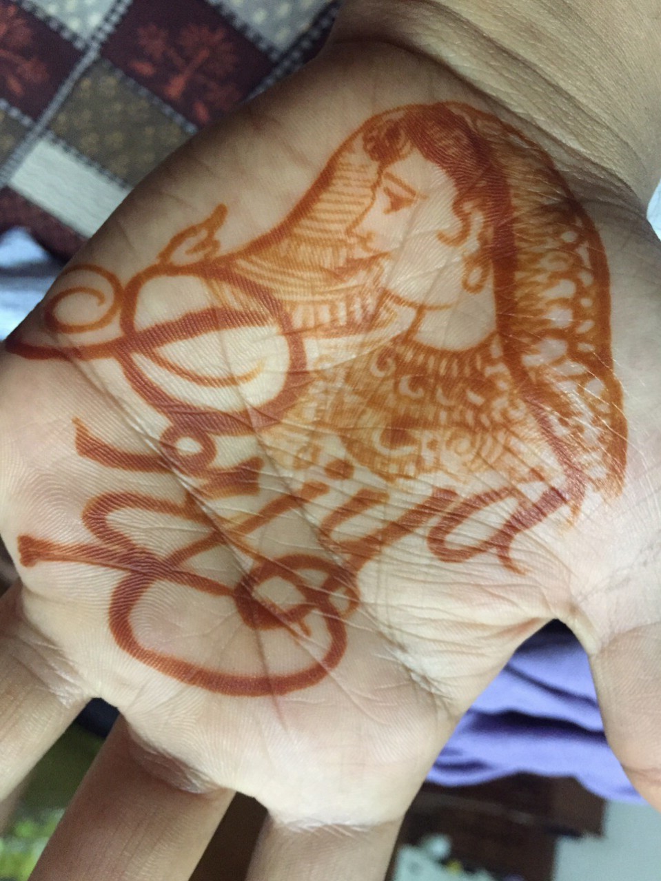 Dit is de henna (opgedroogd) op Pranav’s hand – duidelijk Priya!